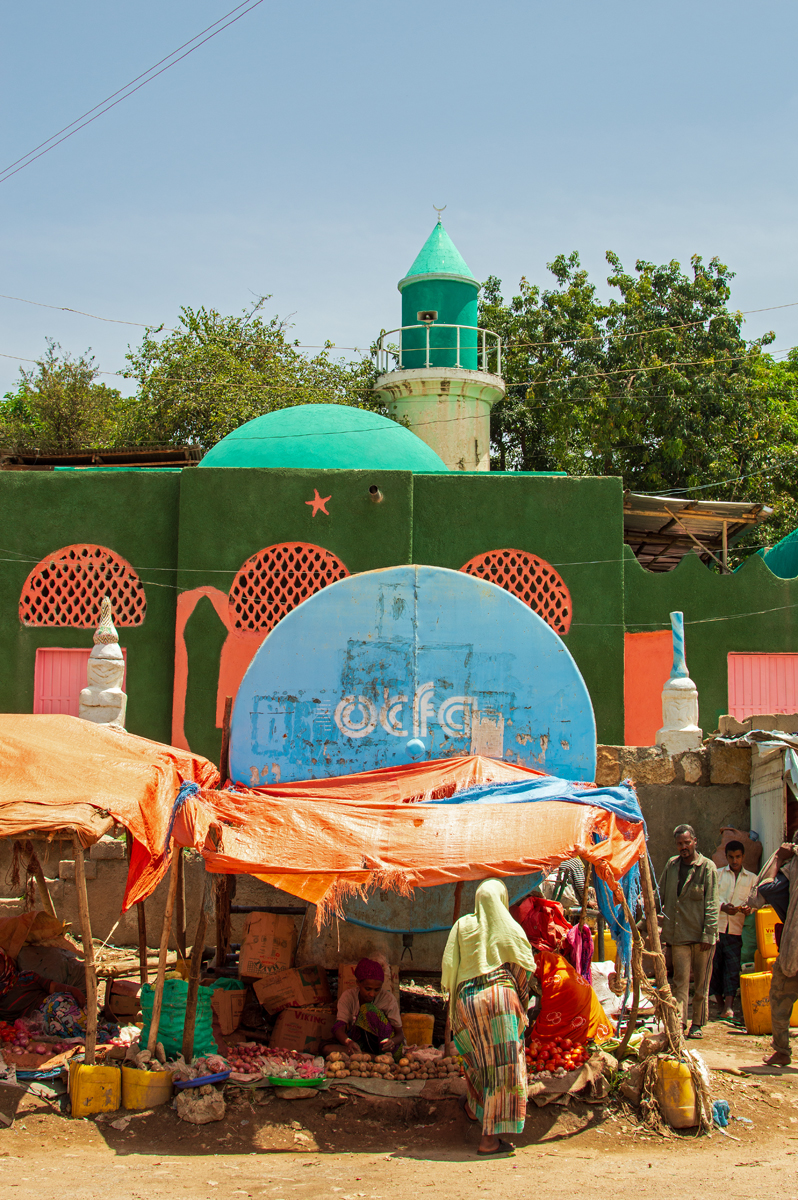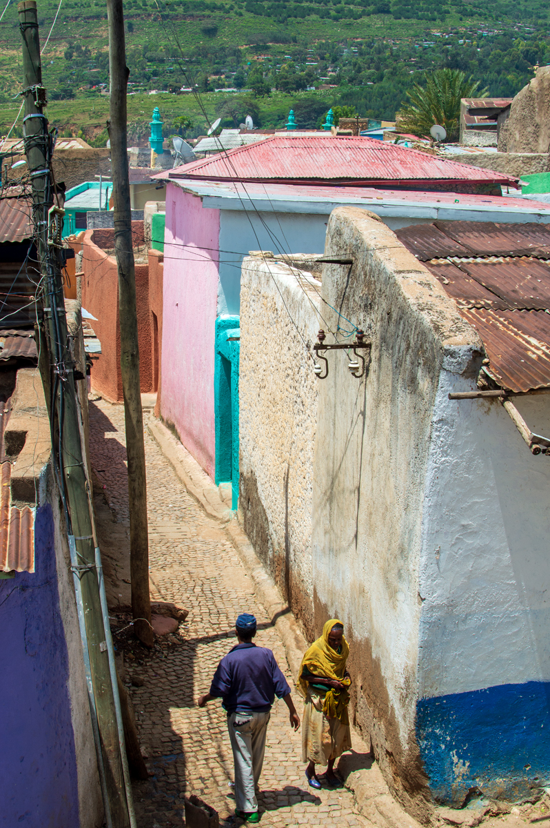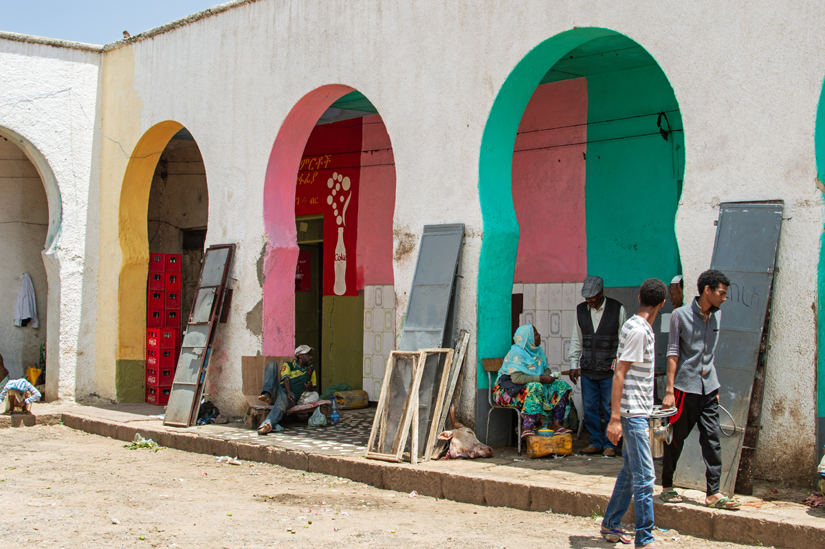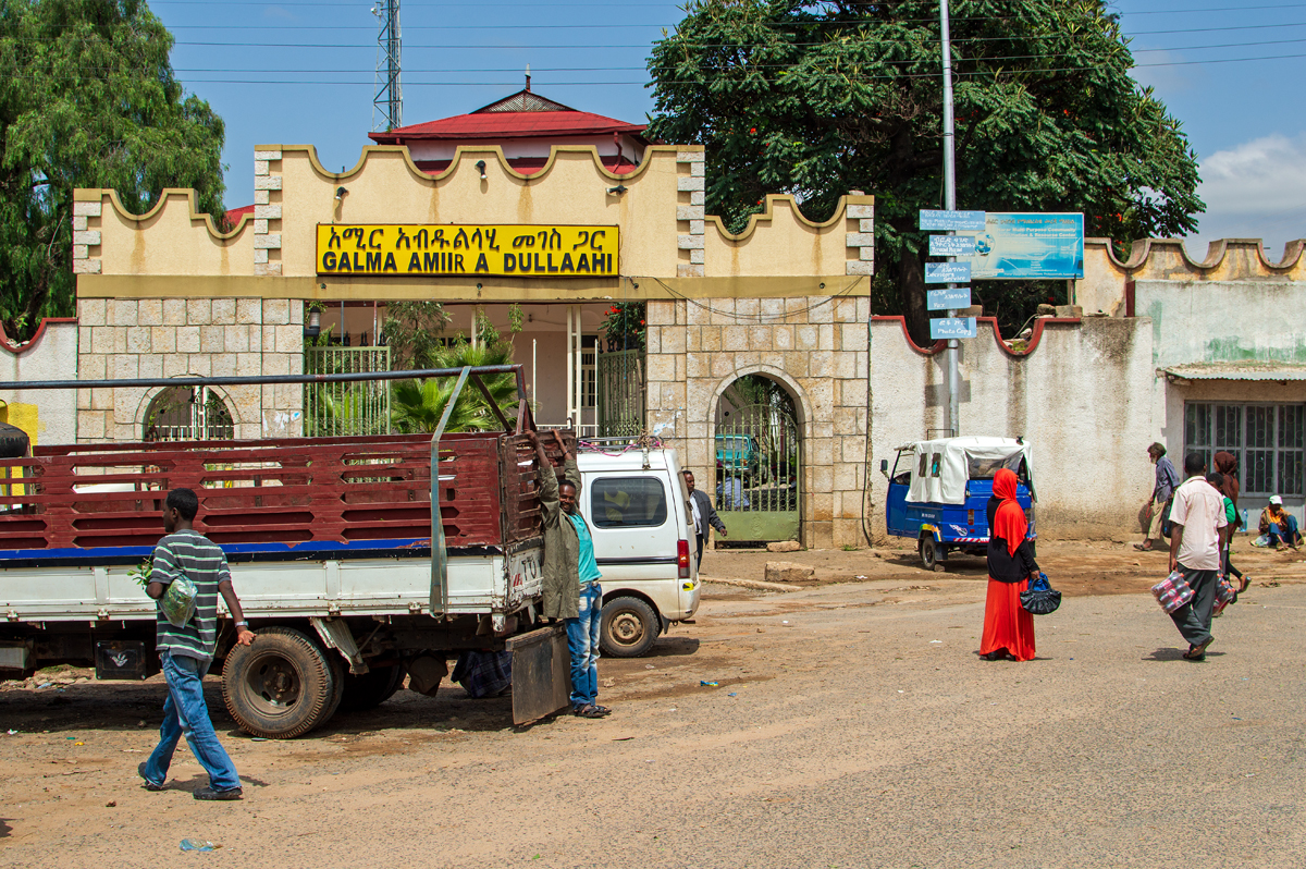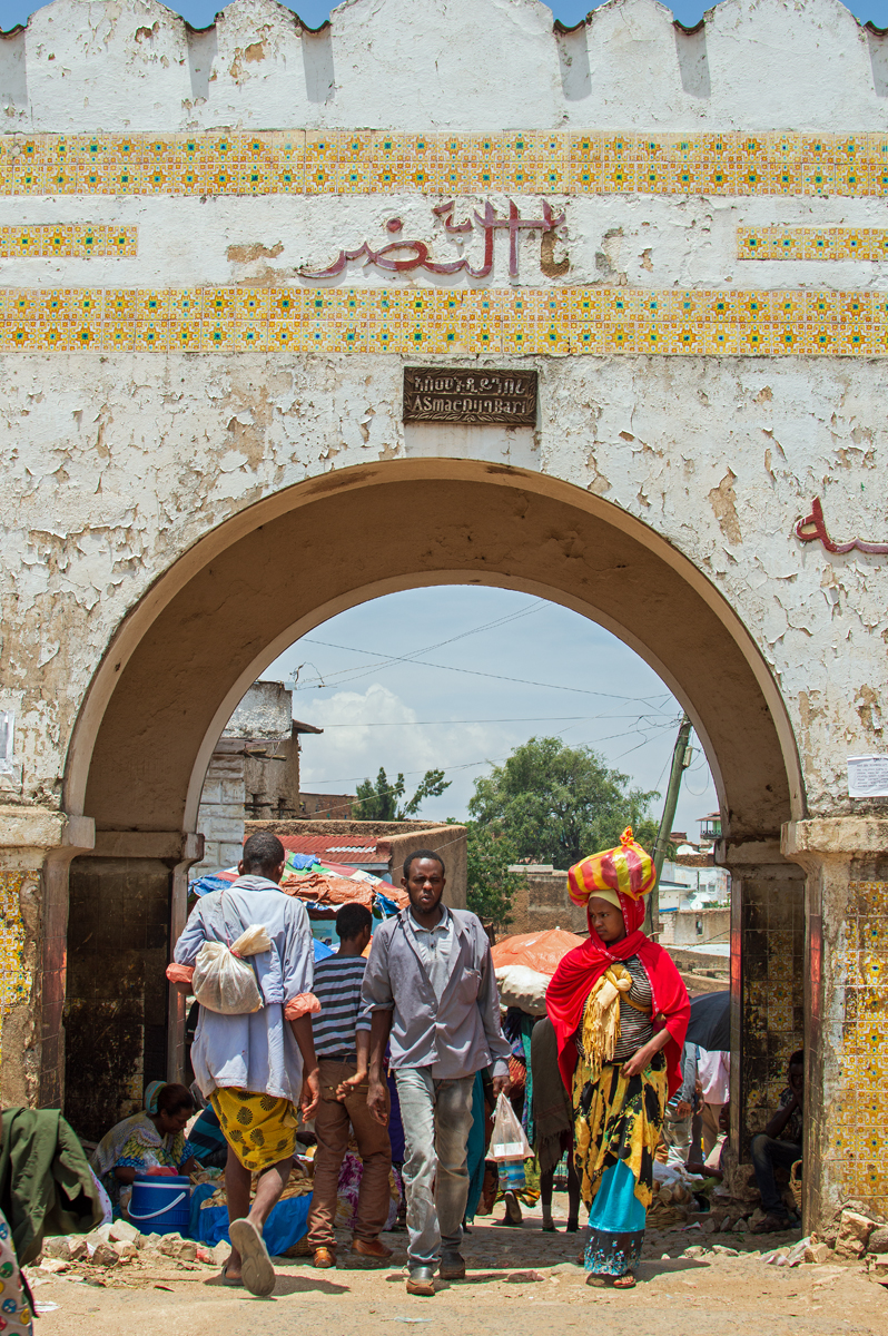 Emir Nur, successor of legendary Ahmed Grang, the one who fought the holy war in the name of the Islam against the Amharic Christians of the highland, had the wall around the town built in the 16th century, with five gates symbolising the Five Pillars of Islam. After the conquest of the town by king Menelik II., he added another two. Through one of it leads the only road accessible by car and meets Feres Megala (horse market) after a few metres, the largest square around old town and the starting point for several alleys leading like sunbeams into the architectural maze.