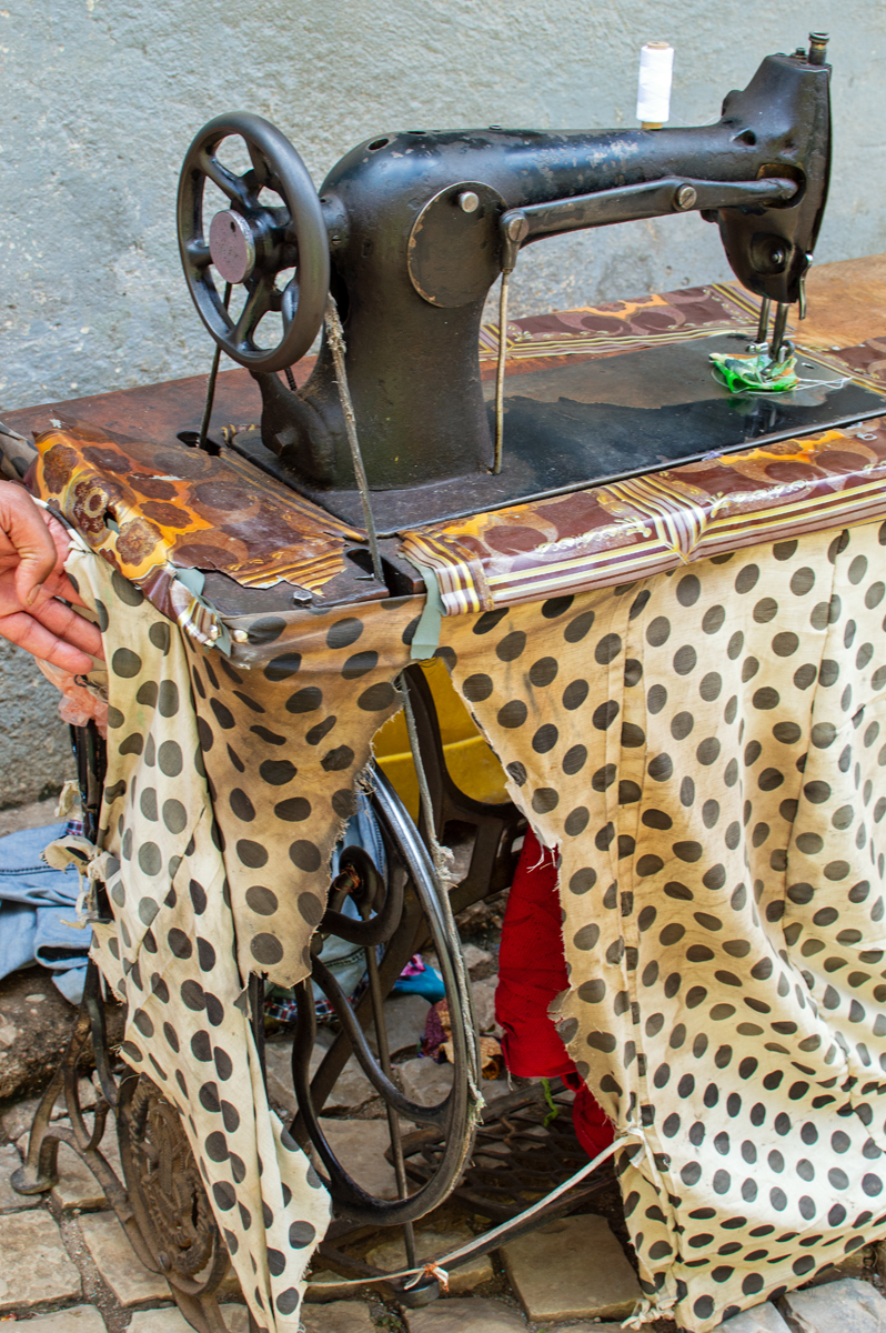 Mekina Girgir is the official name of one of the central alleys, but its nickname is “Sewing machine sound street” due to the tailors sewing with old sewing machines in front of their stores. Customers can buy colourful fabrics and have a suit or a skirt tailored, or they bring their own fabric. The local tailor´s trusted machine is definitely a Singer.