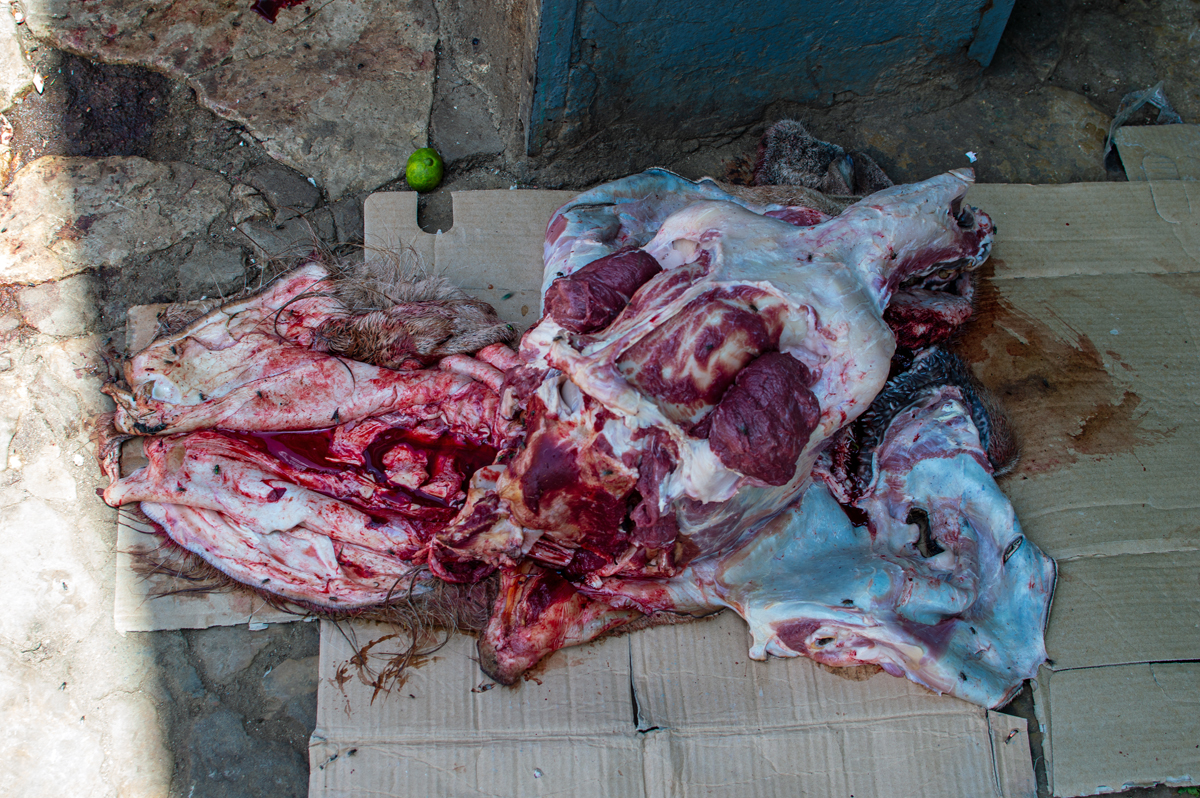 Am Ende der Nähmaschinengasse liegt Gidir Magala, der sogenannte muslimische Markt, der auch Harars größte Schlachterei ist. Hier gibt es – außer Schweinefleisch – alles, was das äthiopische Herz begehrt, und mehr, als mancher europäische Magen ertragen kann. Rind, Huhn, Ziege, Schaf und Kamel stehen gleichermaßen auf der Angebotsliste, und von den Tieren wird nahezu alles verwendet, vom Fleisch über die Innereien bis hin zu den Knochen.
