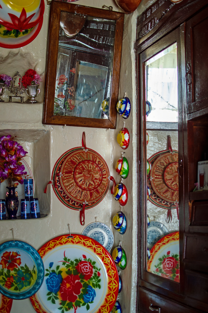 The traditional Aderi houses (gegar) are a rare architectural feature in Ethiopia, including a second floor. The construction is carefully thought out, with thick walls and fillings of straw and soil in the walls, the roof and the floor ensuring a pleasant interior climate in every weather. The most important room is the entrance with divans on different floor levels, for guests or in accordance with the social status for the family members during meal or conversations. The walls are painted with ochre and decorated with weaving products and bowls and plates for celebrations that can easily see hundreds of guests. In eleven traditional niches in the wall, porcelain and jewellery are placed. The most rewarding stores are also found in such private houses, where they also produce numerous handicrafts.