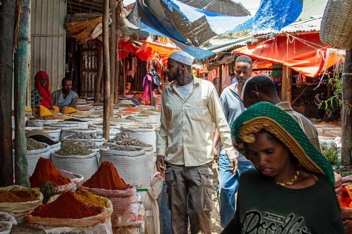 Wie beinahe überall auf dem afrikanischen Kontinent sind auch in Harar die Märkte eine echte Attraktion – inner- wie außerhalb der Altstadt. Darunter sticht vor allem der Gewürzmarkt hervor, eine wahre Sinfonie von Farben und Aromen. Dort gibt es alle Gewürze, Hülsenfrüchte und Nüsse vom Horn von Afrika, genauso wie Weihrauch, der in Äthiopien zur Beräucherung während Buna, der traditionellen Kaffeezeremonie, verwendet wird. Das Salz kommt direkt von den Afar aus der Danakil-Senke. Aber auch Stoffe sind ein wichtiges Handelsgut. Die farbenprächtigen Textilien kommen aus verschiedenen Regionen und Ländern, sowohl aus der näheren Umgebung als auch aus Djibouti, Somaliland, von den Dorze aus Südäthiopien oder aus dem nordäthiopischen Hochland. Farbgebung, Mustern und Verzierungen sind keine Grenzen gesetzt, Hauptsache strahlend und möglichst bunt.