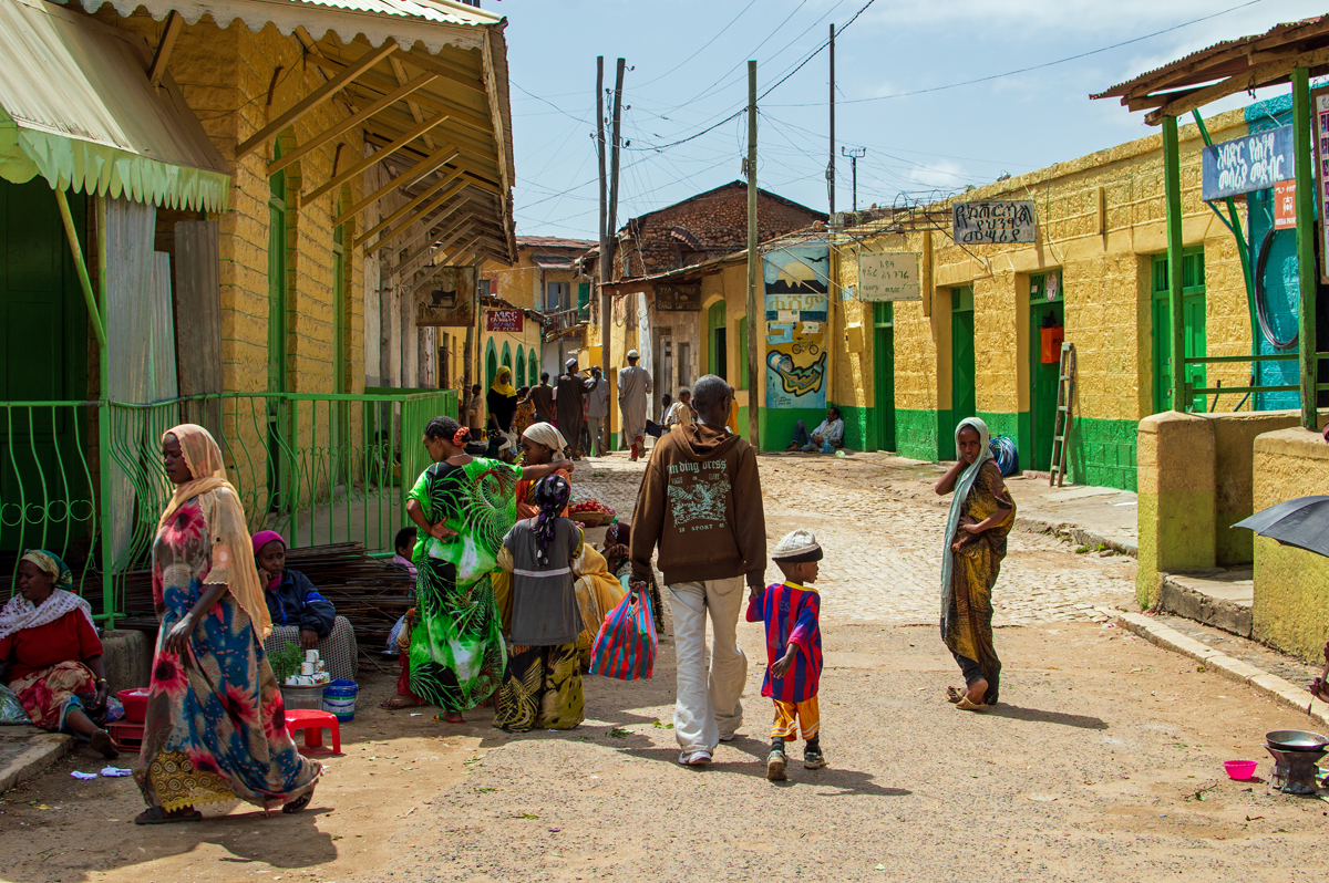 Die sagenumwobene Stadt Harar liegt im Osten Äthiopiens und nur wenige Kilometer von der Grenze zu Somaliland entfernt auf 1.850 Metern Höhe am äußersten Ende des Ahmar Gebirgszugs. Berühmt ist Harar, das heute knapp 200.000 Einwohner hat, für die von einer Wehrmauer umgebene Altstadt, die zum UNESCO Weltkulturerbe gehört. Drumherum ist in den vergangenen 150 Jahren eine typisch afrikanische Stadt voll von Händlern, heruntergekommenen Gebäuden, Wellblechhütten, Müll, knatternden Bussen, Minibussen, Tuk-Tuks und LKWs geworden, deren Bild von Khat und Armut geprägt ist. Harar ist einer der Hauptumschlagplätze für die Droge und deren Jünger und Opfer sind quasi überall anzutreffen.
