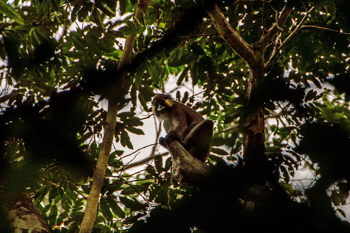 Zwei, drei Stunden folgten wir unserem Guide durch den beeindruckenden und gleichzeitig beeindruckend leeren Wald. Es war wortwörtlich ein Spaziergang im Park, währenddessen wir zwar die Schatten von ein paar Mangaben durchs Blätterdach huschen sahen, aber die meiste Zeit herrschte eine gespenstische Stille, und der Wald wirkte wie ausgestorben. Der Höhepunkt der Wanderung war der Moment, in dem wir einem unsichtbaren Büffel irgendwo vor uns zu nahe kamen. Plötzlich krachte es im Gehölz, als das massive Tier in Panik floh und dabei drei Bäume und mehrere Büsche niederwalzte. Dann kehrte die Stille zurück. Es war Trockenzeit, und in der Trockenzeit müssen die Tiere viel längere Wege zurücklegen, um Nahrung zu finden. Am Ende beantworteten wir sehr höflich die Fragen der beiden jungen Forscher, denn es war schließlich unsere erste Exkursion bei unserem ersten Aufenthalt im Lopé NP gewesen. Es ist allerdings gut möglich, dass unsere Antworten bei unserem zweiten Besuch ein paar Wochen später ganz anders ausgefallen wären.