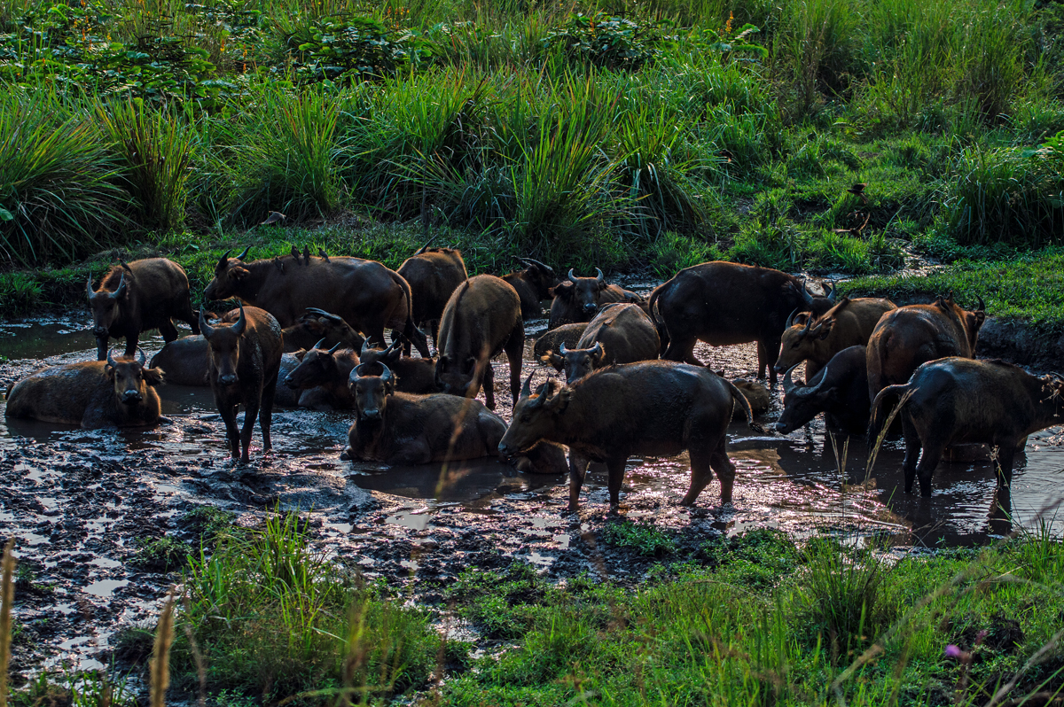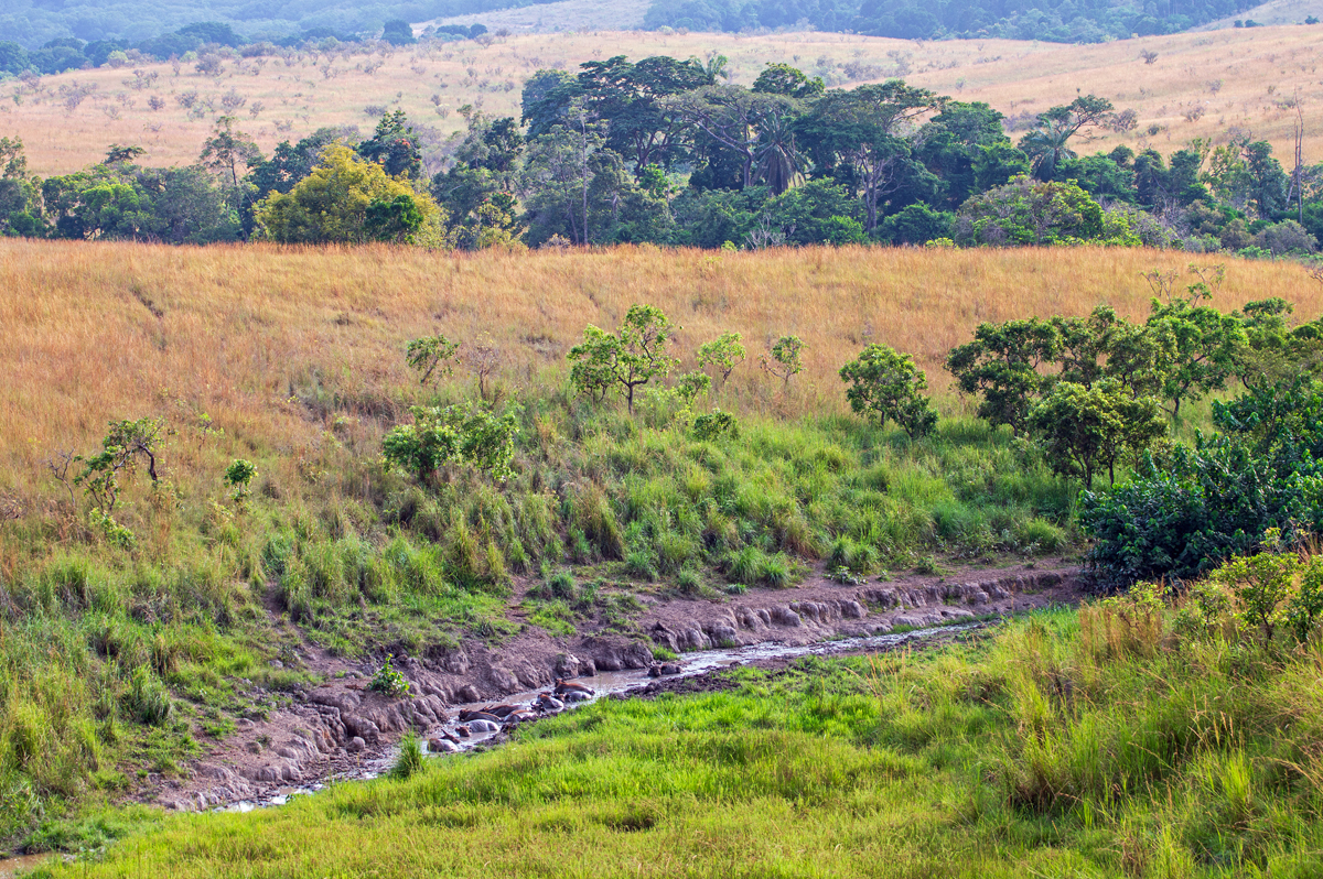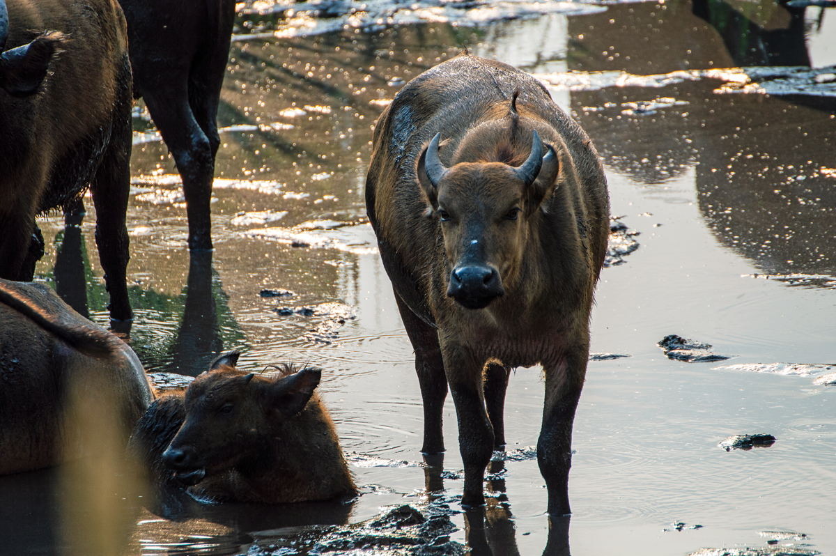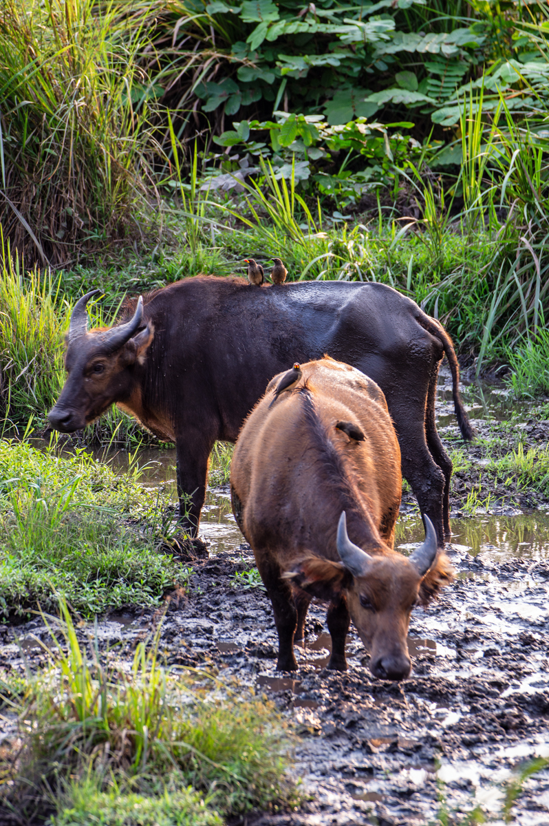 Nach ein paar Kilometern auf einer holprigen Piste hielten wir, um eine kleine Herde Büffel beim Schlammbad im angrenzenden Tal zu beobachten. Kurz darauf hielten wir erneut. Ein Herde Waldbüffel frönte derselben Beschäftigung, aber der Hang war dieses Mal flach genug, und wir konnten uns die Tiere aus der Nähe anschauen. Rote Büffel oder Waldbüffel sind etwas kleiner als ihre Verwandten in den Savannen, und ihr Fell hat eine rötliche Färbung. In der Trockenzeit kommen sie aus dem Wald, um zu trinken und sich ausgiebig im Schlamm zu wälzen, da sich in den engen Tälern zwischen den Savannenhügeln das wenige Wasser sammelt. Ein misstrauischer bis debiler Blick ist übrigens allen Büffelarten gemein.