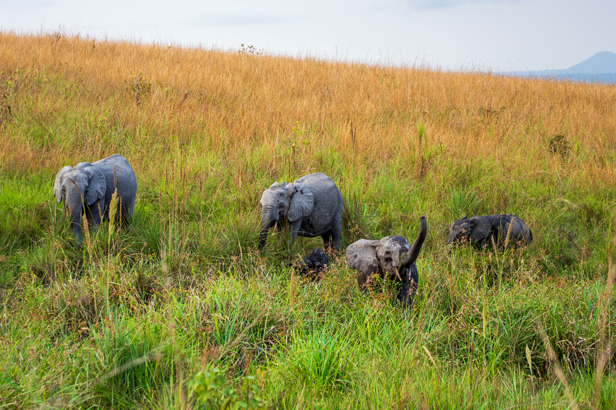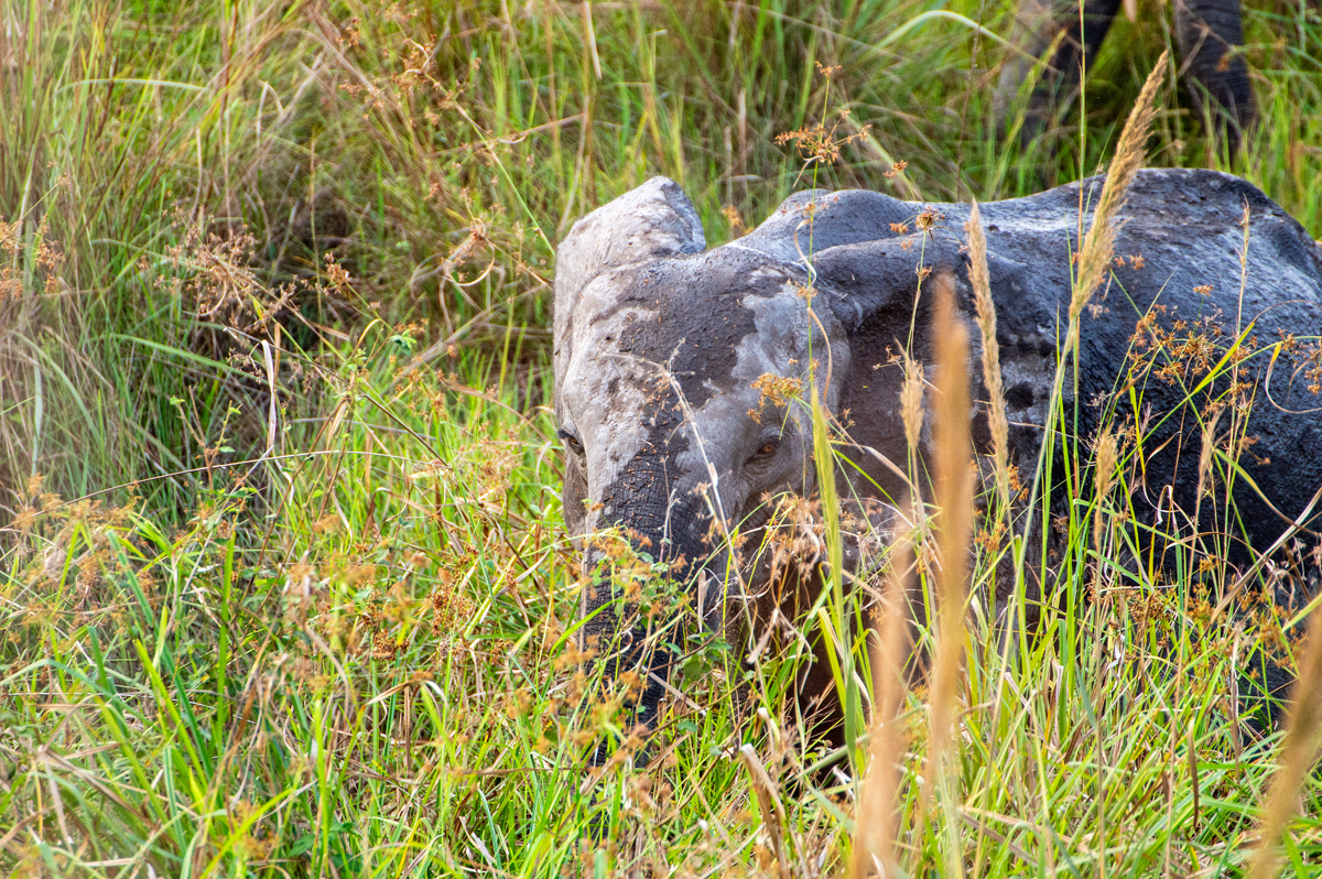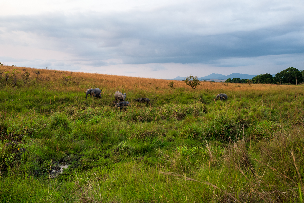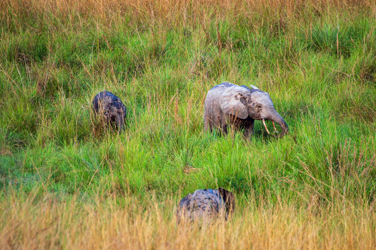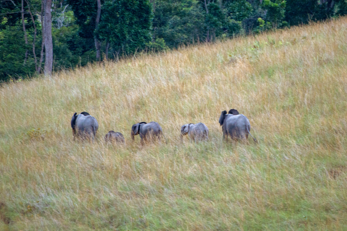 Das Selfie-Mädchen posierte erst einmal für zwei-, dreihundert Selfies direkt vor den Elefanten, aber als diese ihrem Unmut über solch moderne Auswüchse ein wenig Luft machten, schrie sie wie ein Baby, rannte davon, sprang ins Auto und weigerte sich, wieder auszusteigen – was für uns alle das Beste war. Währenddessen blieben wir außerhalb der Fluchtdistanz der Tiere und genossen einfach, die Mini-Elefanten beobachten zu dürfen. Gras und Schilf waren so hoch, dass sie manchmal komplett davon verschluckt wurden, vor allem das winzige Kalb. Dann benutzten sie ihren Rüssel als eine Art Periskop, um sich den Weg zu erschnüffeln. Auf dem Rückweg begegneten wir einer weiteren, kleine Gruppe, die offensichtlich gerade im Begriff war, in den Wald zurückzukehren, wobei die Tiere im Laufen eine Formation bildeten: vorn und hinten liefen die Großen, in der Mitte die Kleinen, hintereinander und in gerader Linie.