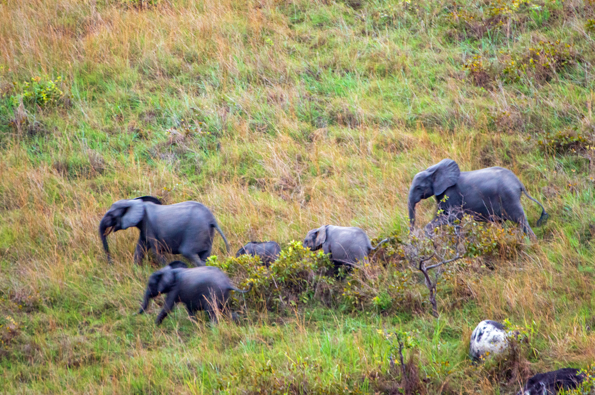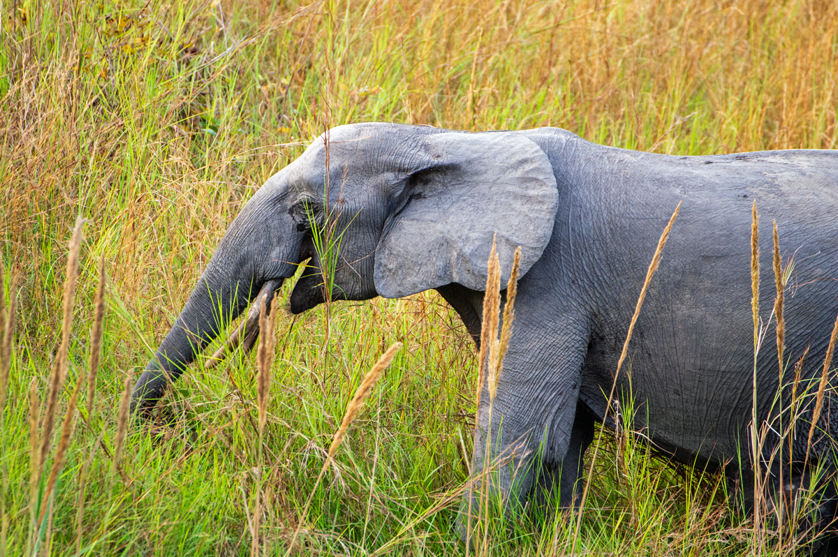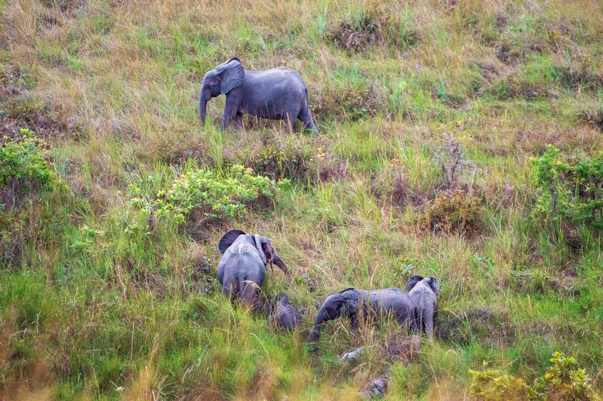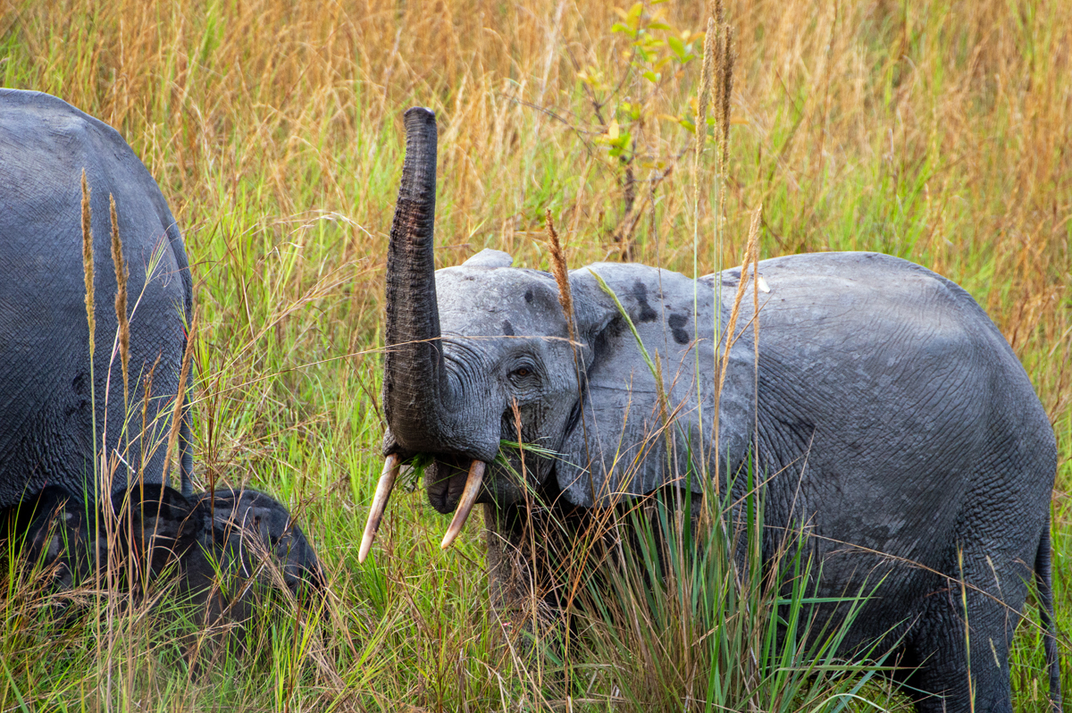 Kurz vor Sonnenuntergang entdeckten wir eine Familie Waldelefanten, die sich zum Abendessen frisches Schilfgras in einer schattigen Senke nahe einem Waldstück gönnte. Wir hatten bereits Hunderte Savannen-Elefanten gesehen, riesige, imposante Tiere, weshalb wir völlig aus dem Häuschen waren, zu sehen, wie klein ihre Verwandten sind. Wir hatten uns zu Fuß bis auf etwa zwölf, dreizehn Meter Entfernung genähert, und das größte Tier der Gruppe war kaum größer als ich, was bedeutet: nicht mehr als zwei Meter Kopfhöhe. In der Gruppe gab es auch ein Kalb, und das war nicht größer als ein Schäferhund.
