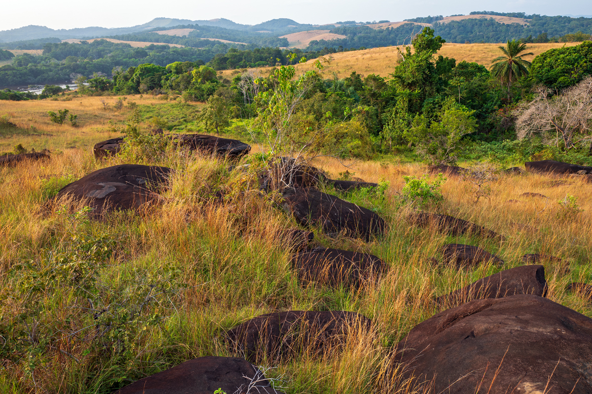 La Lopé lies on the northern boundary of Lopé NP right on the banks of river Oogué and only few kilometres south of the equator. The village is the starting point for trips to the National Park that is one of the bigger parks in Gabon with a protected area of 5.360 square kilometres. Amidst the enormous rainforest which covers most of the country´s area, Lopé is offering a very special landscape. During the last ice age 18.000 years ago, the cool and dry climate led, to some extent, to the disappearance of the rainforest. What was left was open savanna being regained by the forest only 12.000 years ago. Because of the relatively low average annual rainfall as well as the early settlement of man, large areas remained savanna, resulting in the patchwork of forest and savanna one can experience at Lopé today. It is populated by western lowland gorillas, chimpanzees, mandrills, black panthers, forest buffaloes, forest elephants and many other animals – theoretically.