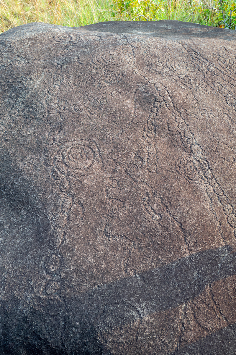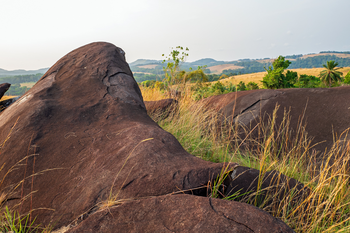 Am nächsten Tag besuchten wir zuerst das Eco-Museum von La Lopé, wo Masken, Werkzeuge, Instrumente und weitere kulturelle Gegenstände ausgestellt werden. Für den Nachmittag hatten wir eine Exkursion zu eisenzeitlichen Felsgravuren geplant. Die ältesten archäologischen Fundstücke zeigen sogar, dass Menschen sich bereits seit etwa 400.000 Jahren in dem Gebiet aufhalten. Und es war tatsächlich durchaus beeindruckend und bewegend, an jene Eisenzeit-Menschen zu denken, wie sie vor 3.000 oder 4.000 Jahren Karten oder rituelle Symbole in die dunklen Felsen am mächtigen Oogué ritzten. Einen spektakulären Sonnenuntergang bekamen wir noch gratis dazu.