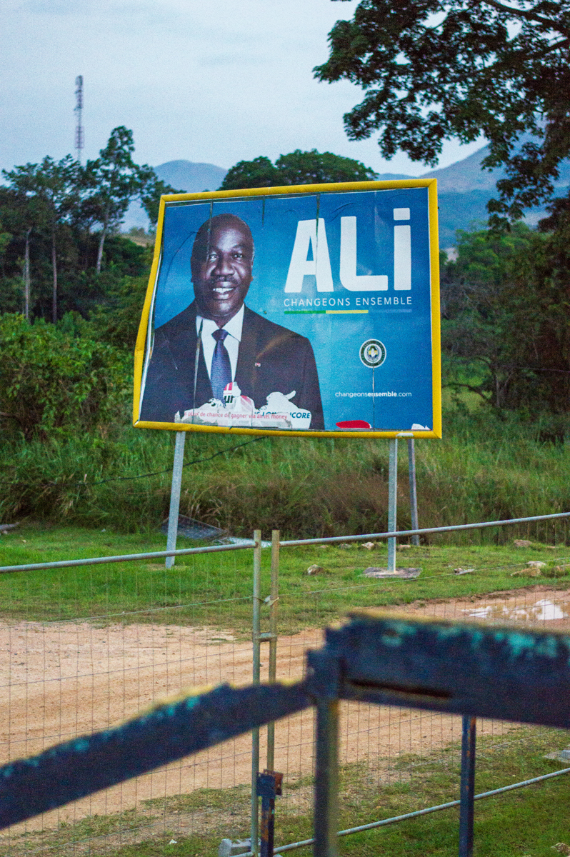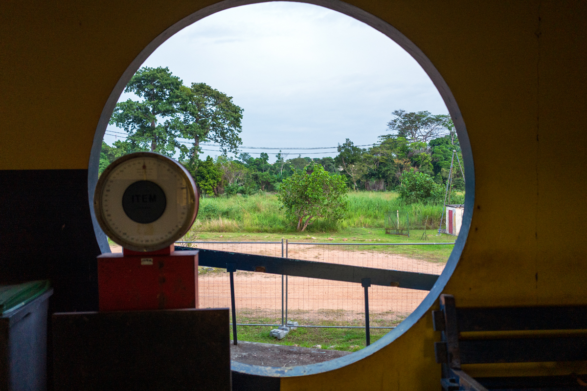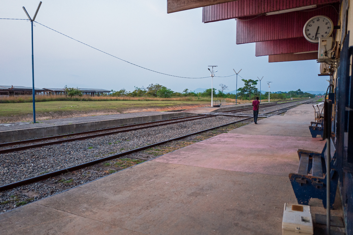 Die Bahnhöfe entlang der Strecke der Transgabonais sehen alle gleich aus, gelb und blau gestrichene Gebäude mit riesigen kreisrunden Öffnungen zur Vorderseite sowie einem offenen Warteraum mit klassischen Fahrkartenschaltern und den ungemütlichsten Holzbänken, die man sich vorstellen kann. Und ein Flachbildschirm, auf dem an diesem Abend ein Vorrundenspiel der WM lief. Deutschland war bereits raus, und ich kann mich nicht mehr daran erinnern, wer überhaupt gespielt hat, aber die Partie sorgte wenigstens für etwas Ablenkung.