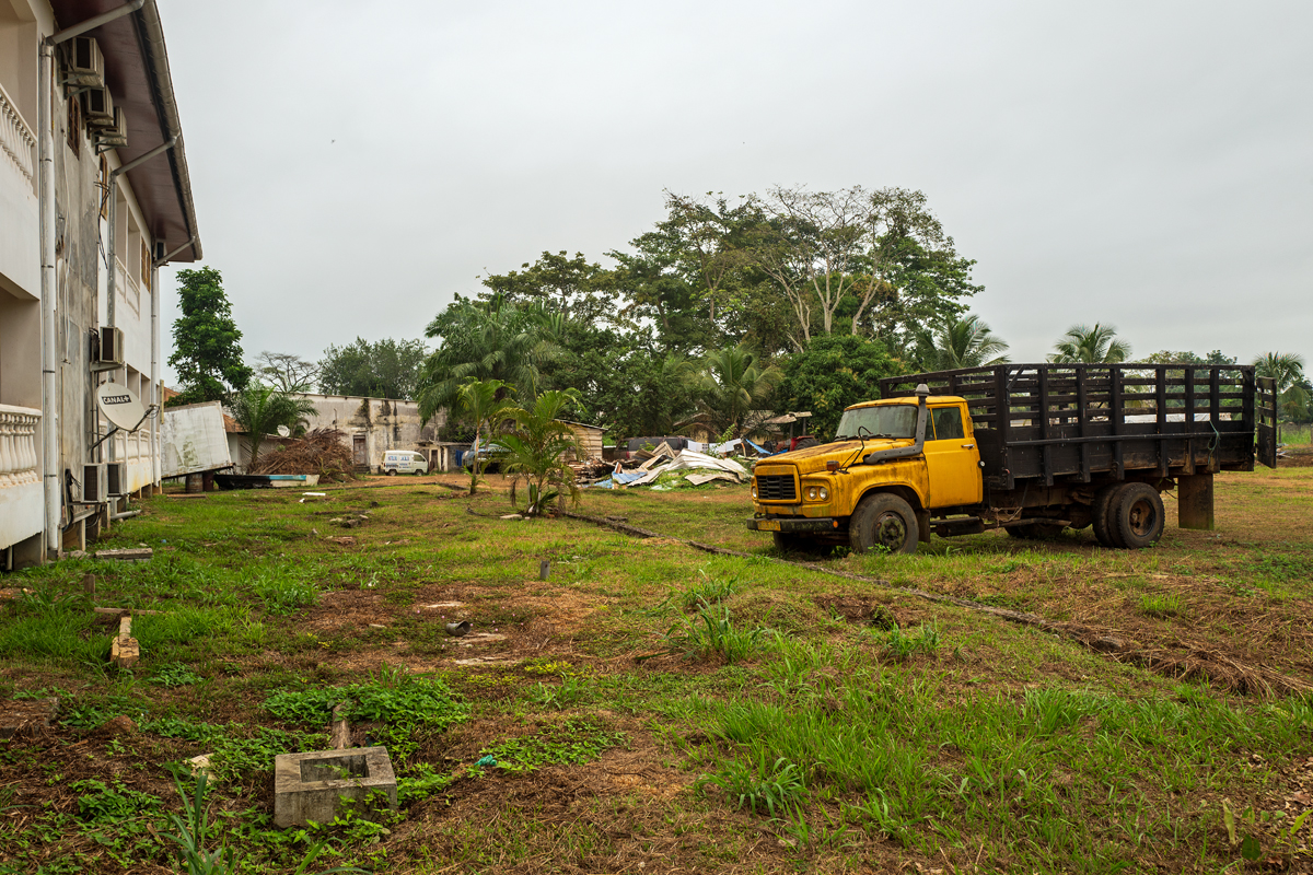 After returning to Lambaréné from Port Gentil by boat, we got ourselves a shared taxi to Mouila with a funny driver and a funny lady who directed us to the Hotel du Lac Bleu right at the bank of Ngounié river. On the way, we passed several police and Gendarmerie checkpoints. The driver and the lady seemed quite familiar with the traditional rituals as well as every single officer, always providing the correct amount of money along with the drivers license and the insurance papers and always striking the right tone when chatting with the officials. Furthermore, we recognized, that it is essential for the perfect Gabonese garden to have it equipped with a decently wrecked car or truck. Taste can be quite diverse.