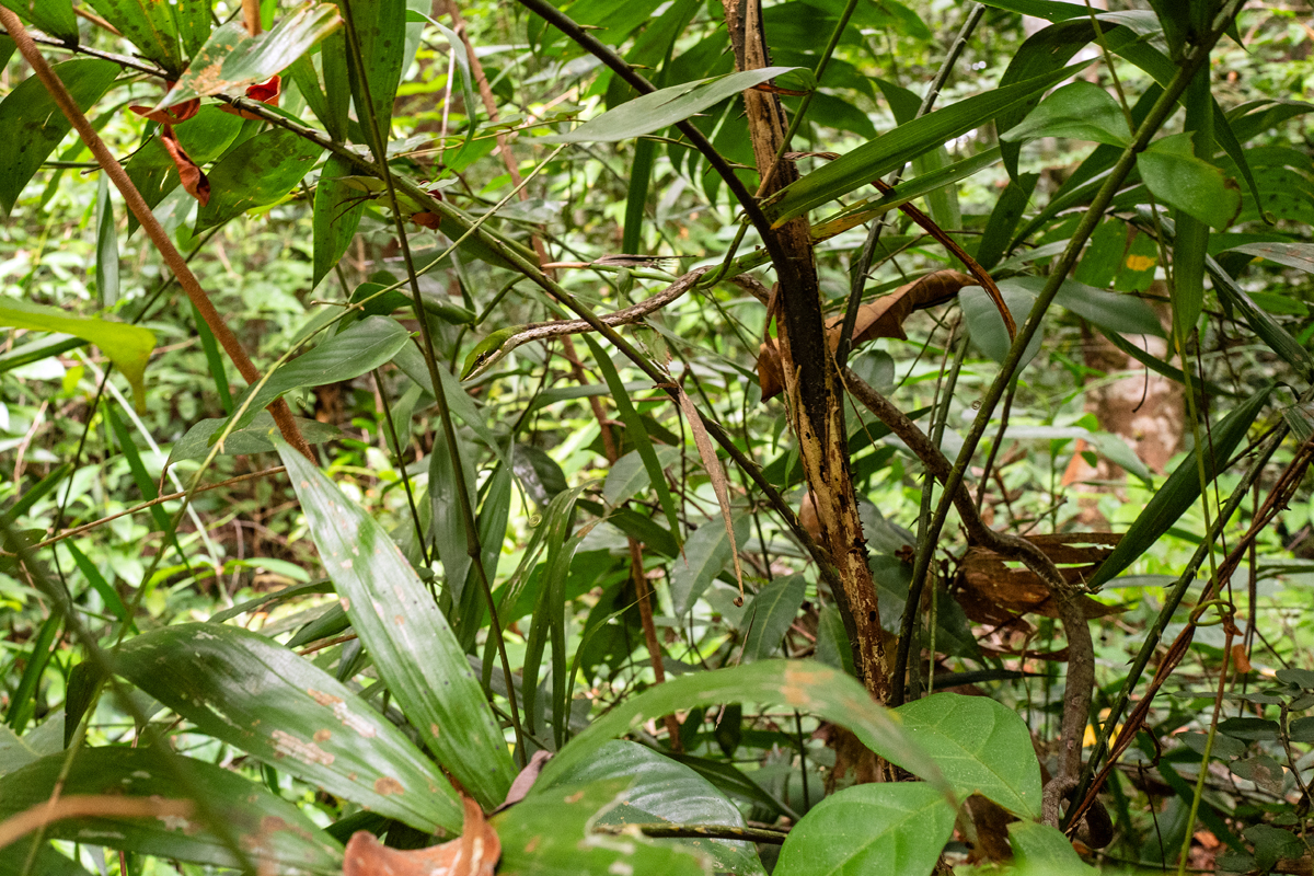 The beach was one of the most idyllic I have ever seen – if one is able to ignore all the plastic trash. Even though we expected some army divers to arise from the sea at every moment, or paratroopers jumping down on us but fortunately, everything remained calm and peaceful. On our way back, we even had a nice wildlife experience when we flushed a forest vine snake taking a sunbath on the trail. It hid in the bush right next to the trail, but I had only my Leica with the wide-angle lens with me, so I had to stick the camera right into the bush with the highly venomous snake to get a decent picture. I was hoping that the first attack would address the lens and not my fingers which I tried to hide behind the camera as best as possible. But the snake just observed me curiously until I had managed to make my photo. Then we left her as well as the forest, Libreville and the country – after a somehow quirky, infinitely strenuous and bitter journey.