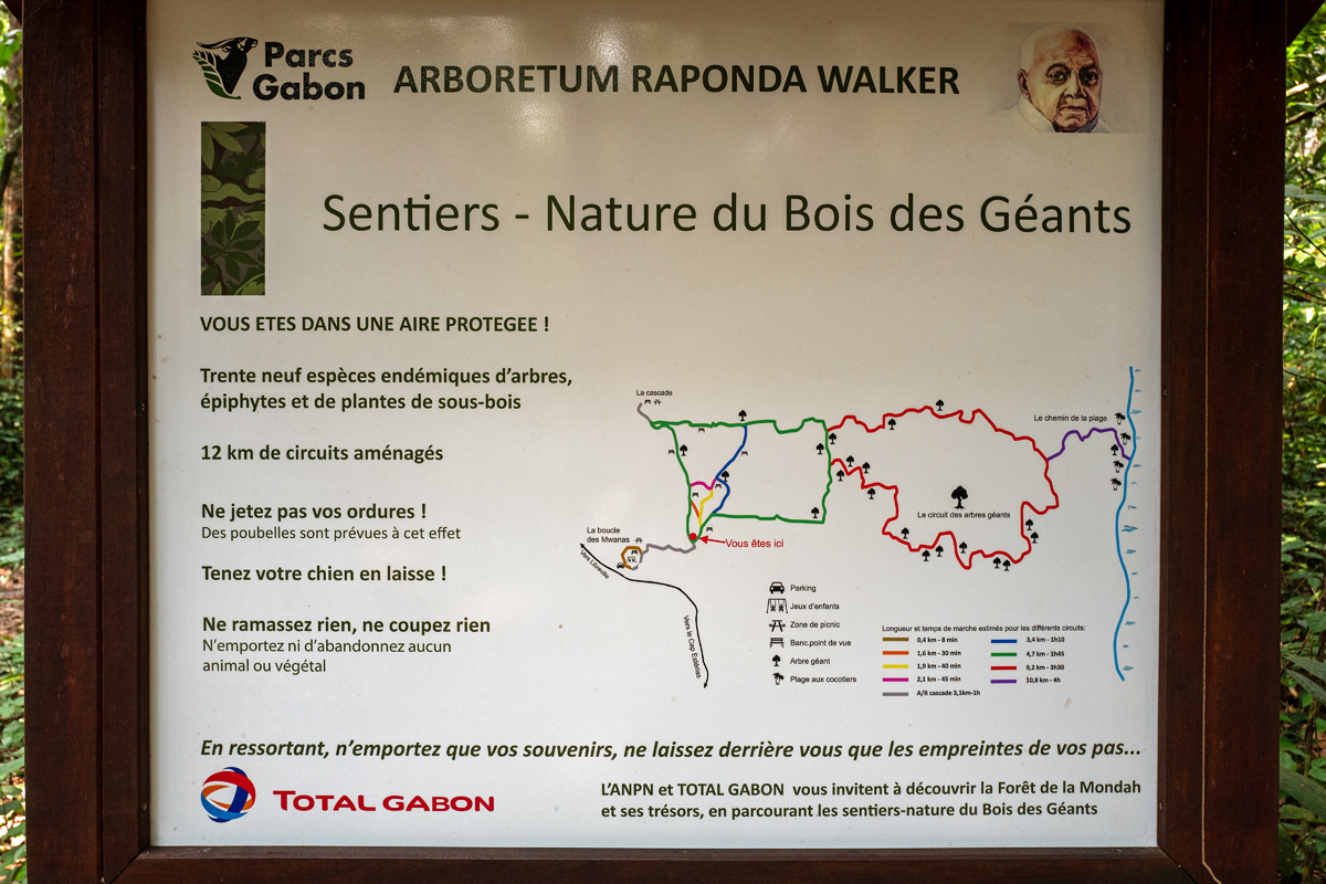 We took a taxi to cover the 20 km to the Arboretum, which we really wanted to visit because one could hike there for free and without a guide, immerse in the rainforest on marked footpaths. There is younger secondary forest as well as remnants of the ancient primary forest, including giant trees of up to 60 m height. The forest is home to a widespread variety of insects, birds, reptiles and soldiers. Because a part of the area is a restricted zone of the Gabonese army for training guerilla warfare in the rainforest.