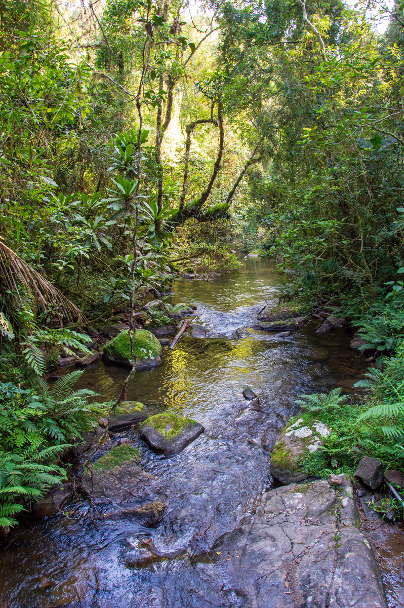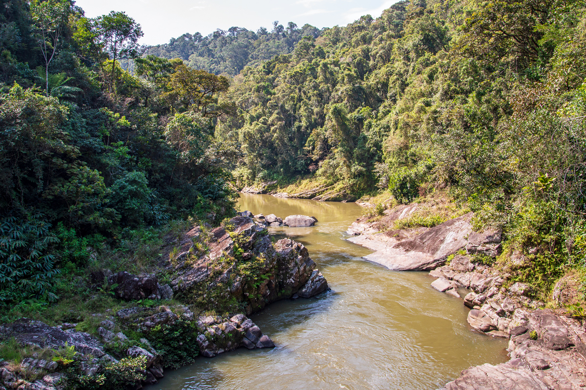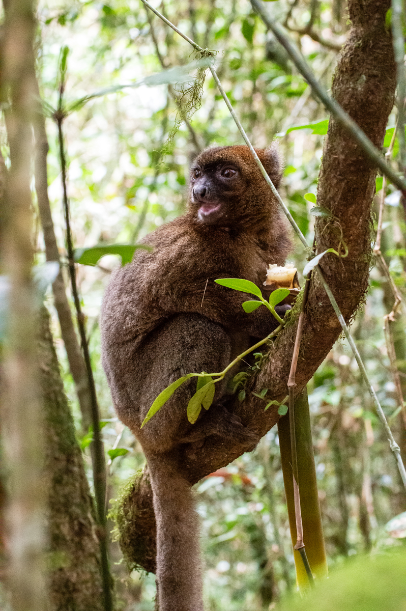 Bei einer Wanderung im Nationalpark Ranomafana, dem mit über 40.000 Hektar drittgrößten Schutzgebiet Madagaskars, betritt man mit der Überquerung des Namorona eine feuchte, grüne Welt, die voller Leben, aber zuerst einmal viel stiller ist, als man das erwartet. Doch natürlich dämpft die dichte Vegetation alle Geräusche, und das Knacken und Knistern des Laubs und des Unterholzes unter den eigenen, angestrengten Schritten ist in jedem Fall lauter als alles andere. Die Luft ist feucht, es ist warm, aber nicht heiß. Immerhin befindet man sich in einem Bergregenwald auf bis zu 1300 Metern Höhe. Überall gleiten elegante Schmetterlinge wie der riesige Kometenschweif zwischen den Stämmen umher, es ist dunkel unterm geschlossenen Blätterdach, welches das grelle Sonnenlicht nur in scharfen Streifen hindurchlässt. Fotografieren wird bei diesen Lichtverhältnissen zur Herausforderung. Tiere zu entdecken ebenso. Doch die gut ausgebildeten Naturführer kennen sich aus und können noch den kleinsten Gecko, die winzigste Sonnenanbeterin und den quirligsten Lemur im grünen Dickicht ausmachen. Die plüschigen „Geister der Verstorbenen“ (Lemures, lat.) mit den riesigen Augen sind denn auch die Attraktion des Waldes und ebenfalls nicht allzu leicht zu finden. Noch 1986 hat der Deutsche Bernhard Meier eher zufällig den bis dahin unbekannten Goldenen Bambuslemur in den Wäldern von Ranomafana entdeckt, eine der seltensten Lemurenarten, deren Status als „kritisch“ eingestuft wird. So wie der des Großen Bambuslemurs, der sich in Ranomafana fast ausschließlich von Cathariostachys madagascariensis, einer selbstverständlich endemischen Bambusart ernährt. Oder der extrem seltene Rotbauchmaki, oder der Milne-Edwards-Sifaka, oder, oder, oder. Mit etwas Glück entdecken die Guides die – tagaktiven – Lemuren in den Wipfeln der Bäume oder sogar beim Fressen auf Augenhöhe, und auch zahlreiche Vögel können im dichten Wald beobachtet werden.