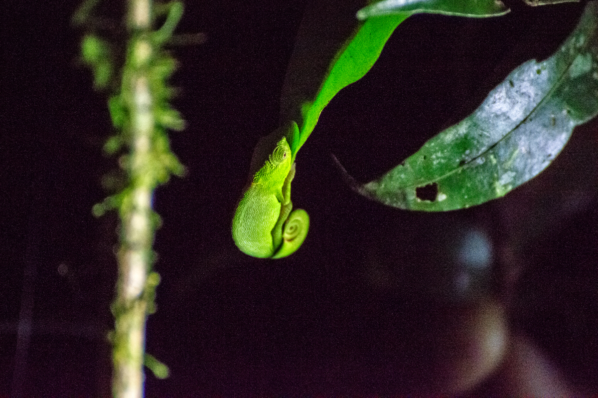 But the true stars of Ranomafana are way smaller, and to be honest: quite different, sometimes bizarre, and at other times just strange. The true stars of the rainforest are reptiles and amphibians. There is a huge diversity of frogs, chameleons and geckos inhabiting the ground and the undergrowth as well as higher levels in the forest skyscrapers. New species are discovered annually, and it´s impossible not to stumble over tiny, well camouflaged frogs every three steps while hiking in Ranomafana. On the contrary, chameleons are easier to find on a night walk while sitting on a twig or hanging from the tip of a leaf sleeping. Then they also aren´t changing colour anymore, and illuminated by a torch, they start to glow because of their skin reflecting the light, and you can easily spot them in the covert. Among them are also specimens of the Brookesia species including Brookesia micra, the smallest reptile on earth. It could comfortably sit on on your thumbnail!