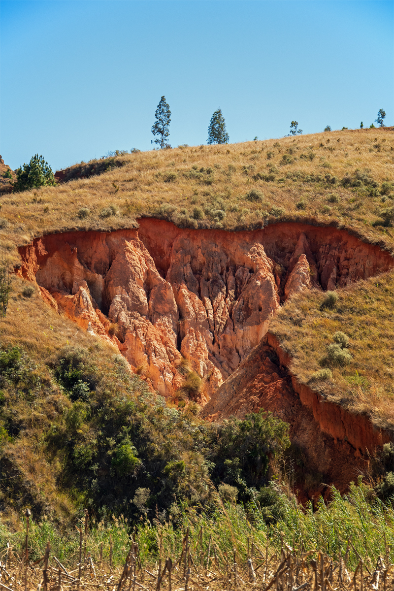 Die letzten Regenwälder an den steilen Hängen entlang der Ostküste sorgen dafür, dass dort die ursprüngliche Landschaftsstruktur erhalten bleibt. Im Rest des Landes dagegen bröckelt und bröselt es unaufhörlich. Die Trocken- oder Dornenwälder, die einst große Teile des Südens, Westens und Nordwestens Madagaskars bedeckten, sind verschwunden und können kein Wasser, sei es das des seltenen Regens, tiefes Grundwasser oder die in den kühlen Nächten kondensierende Luftfeuchtigkeit, mehr binden, keine Böden durch ihr Wurzelgeflecht stabilisieren und so vor Erosion schützen. Die Böden sind Wind und Wetter ausgeliefert, jede Regenzeit nagt an den Hügeln und Bergen, fräst tiefe Schnitte in die Hänge, die irgendwann instabil werden und unter dem eigenen Gewicht einstürzen.