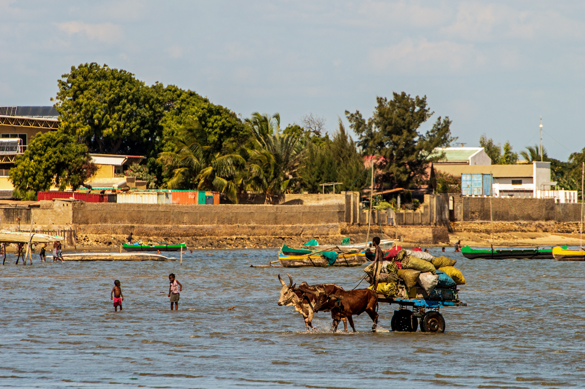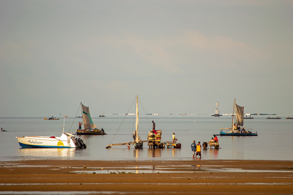 Nur gelegentlich legen größere Frachter im Hafen an, Container bleiben da schon mal länger stehen. Denn der eigentliche Hafen liegt sowieso ein paar Meter weiter. Dort, am Strand von Toliara, der im Rhythmus der Gezeiten überspült und trockengelegt wird, landen die Fischerboote an, unter ihnen zahlreiche Vezo, die die Küste von Morondava und Morombe im Norden kommend entlanggesegelt sind. Zumeist kommen die Boote mit einsetzender Ebbe herein, so dass bis zur nächsten Flut Zeit für das Ent- und Beladen sowie einige Geschäfte bleibt. Das Be- und Entladen der Boote erfolgt in Toliara mithilfe von Zebu-Karren. Je nach Tidenstand ziehen die mächtigen madegassischen Buckel-Rinder die Karren bis zum Hals im Wasser zu den Booten, entweder, um Waren loszuwerden oder aufzunehmen, vornehmlich Lebensmittel und Alltagswaren, denn viele der Dörfer an der Küste sind nur auf dem Seeweg zu erreichen. Alles, was nicht selbst hergestellt werden kann, muss per Piroge übers Meer transportiert werden. In den Säcken, die ausgeladen werden, ist zumeist Holzkohle, Brennstoff Nummer eins auf Madagaskar. Ihr fallen die letzten Wälder der Insel zum Opfer, die sich noch der finalen Erosion entgegenstellen.