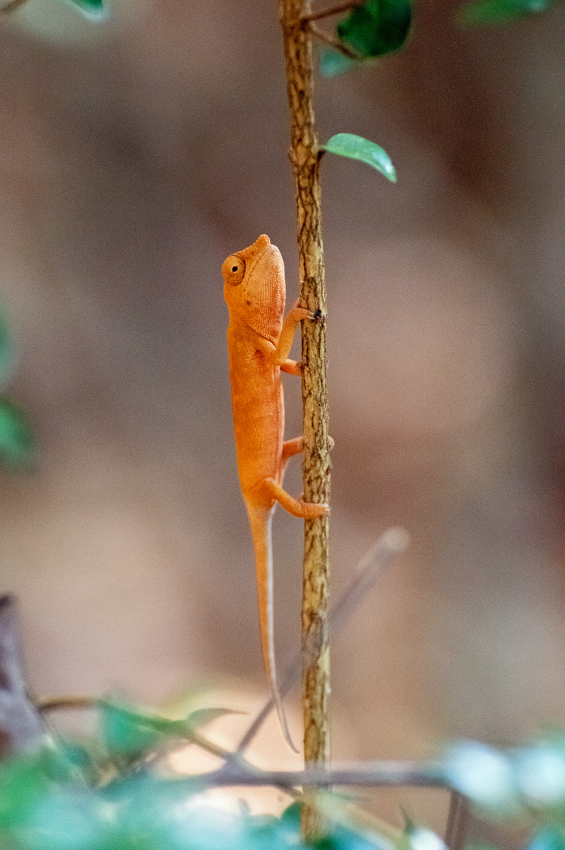 Even the chances of stumbling over nocturnal lemurs are not that bad. If you are really lucky, you can spot them high up in the trees around the camp right after sunset or on a trek with a guide in the early morning hours. Then, those cute primates like the Milne-Edwards Sportive Lemur or some Mouse Lemurs – among them the world’s smallest primate – are sitting outside their tree holes or in a well-hidden fork of a branch warming their bones in the first rays of sunshine after a chilly night on their search for food before sleeping the day away in their hiding place. It is reasonable, especially for the Mouse Lemurs feeding on fruits, blossoms and leaves as well as small insects, because of less food being available in southern/austral winter. To avoid wasting too much energy, they fall into torpor condition, a kind of brumation where body-temperature and metabolic rate are lowered to a minimum. In the morning they use the warmth of sunshine to rejuvenate. Chameleons also do like it warm, so they are sleeping at night, ignoring the bleakness while hanging on a leaf, in between some branches or in the greenery. Not until sunrise do they get active before searching for food like all the other lizards and snakes in the forest, while the birds start their chanting.