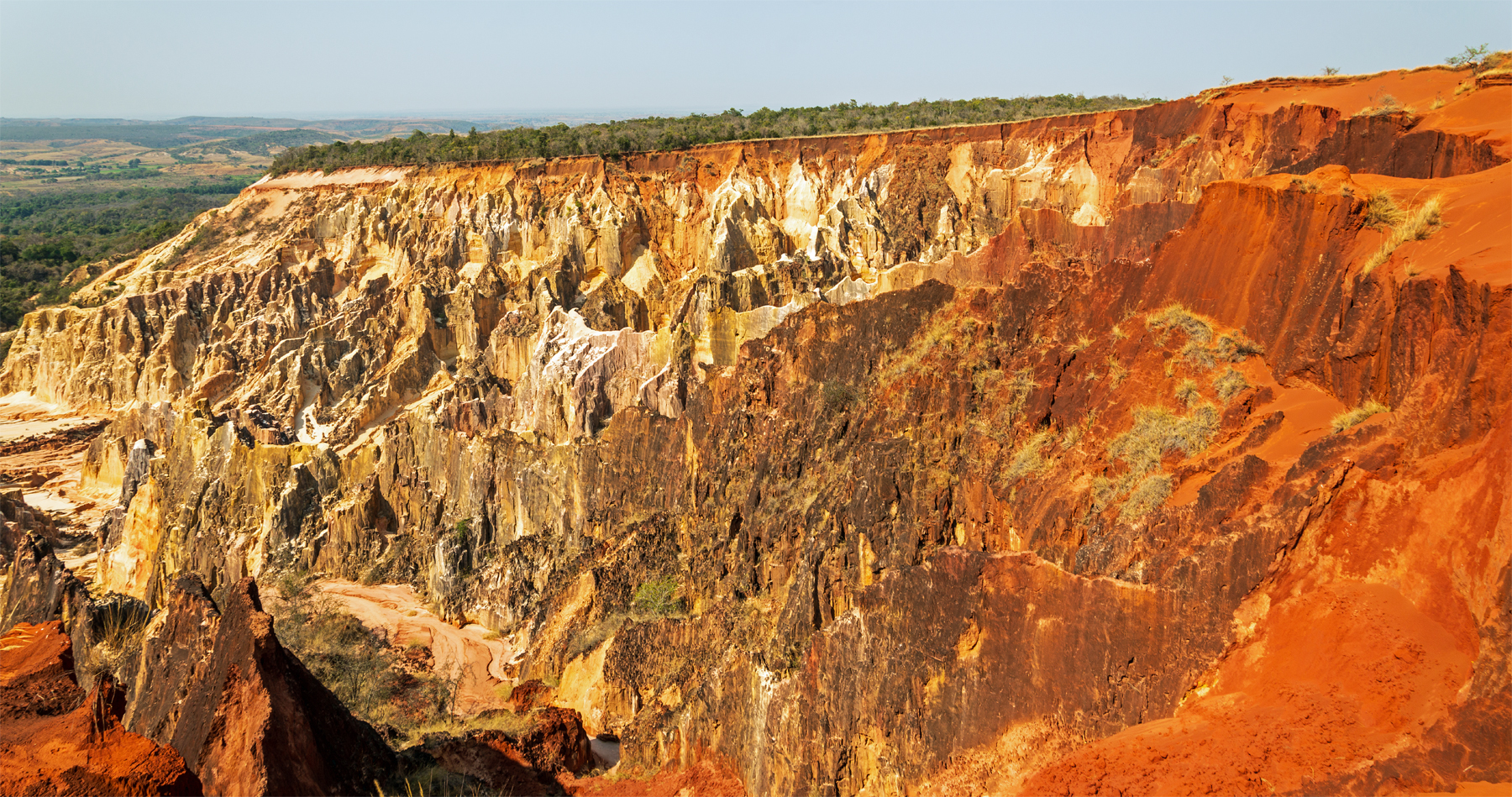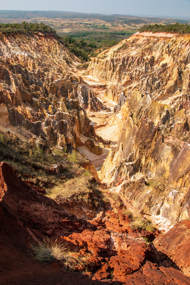 Bei einer Wanderung durch Ankarafantsika erreicht man irgendwann die unnatürlich scharf gezogene Grenze des Waldes, an der eine karge Steppe beginnt. Bis zu dieser Linie war der Wald vor Einrichtung des Schutzgebiets bereits gerodet worden. Übrig geblieben ist eine kahle Ebene, deren Boden schutzlos Wind und Wetter ausgeliefert ist. Grasbüschel halten den roten Sand noch zusammen, aber aufhalten kann das die Erosion nicht. Unweit eines Mobilfunkmasts ist diese Ebene dann plötzlich verschwunden, und zu Füßen der Wanderer erstreckt sich „La Vallée“, das Tal, wie es schlicht genannt wird. Unglaubliche Farben und Formen, die eine zerklüftete Schlucht bilden, die an dieser Stelle den Rand der Platte von Ankarafantsika markiert. Wie Keramiksplitter ragen unzählige bunte Felswände aus dem gelben bis roten Sand, und wie auf einer Rasierklinge wachsen obenauf sogar Bäume und Sträucher. Die Farbpalette reicht dabei von Schwarz und Grau über Grün, Blau und Violett bis hin zu allen Schattierungen von Rot und Gelb, die am stärksten vertreten sind.