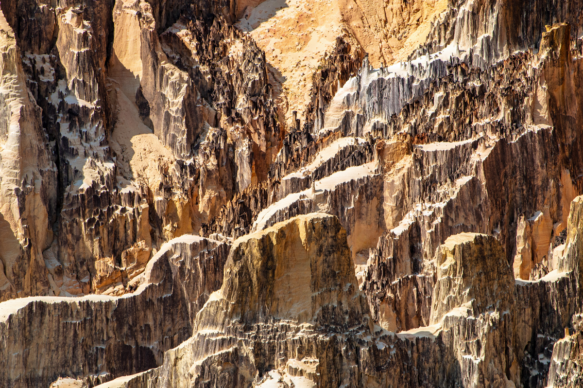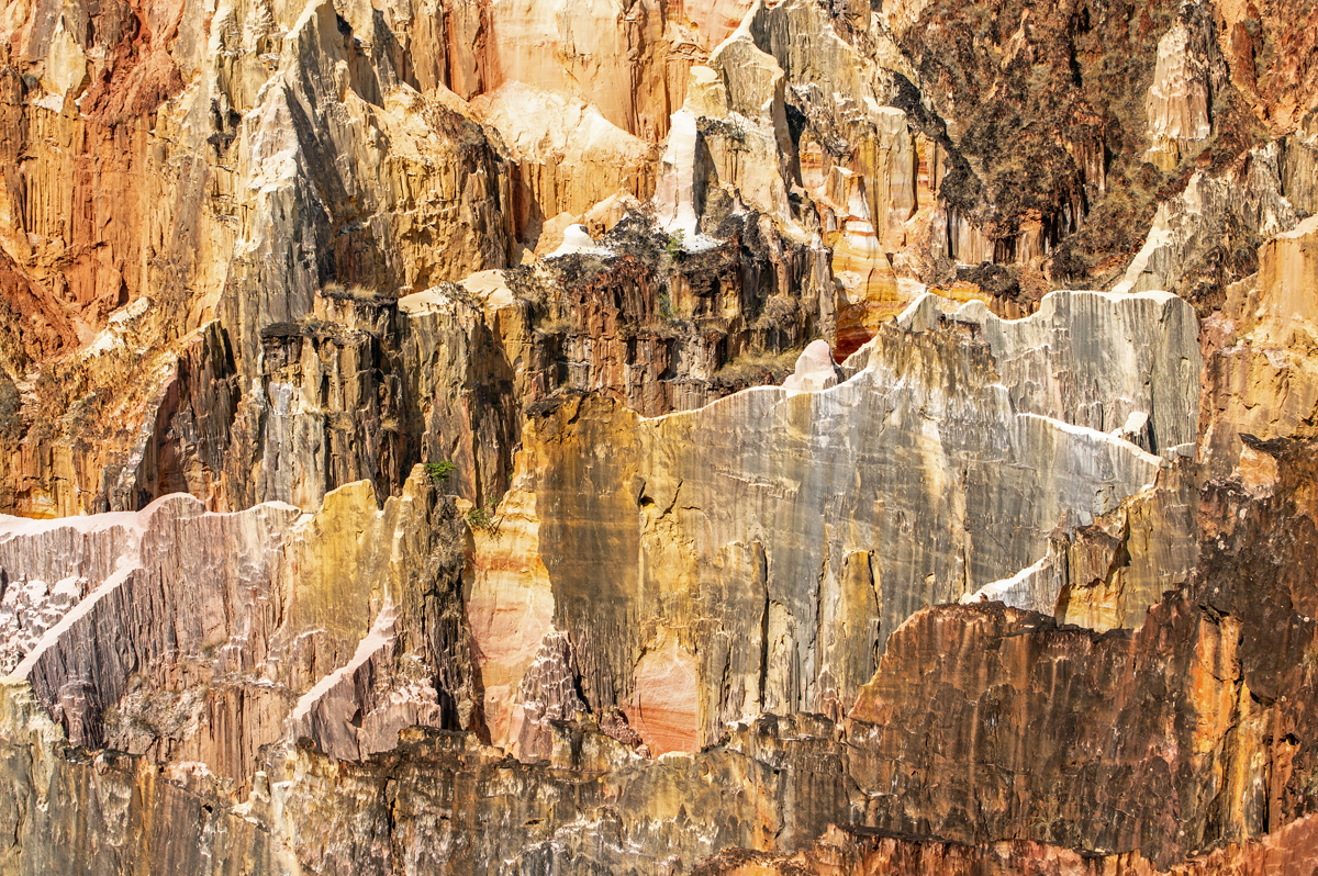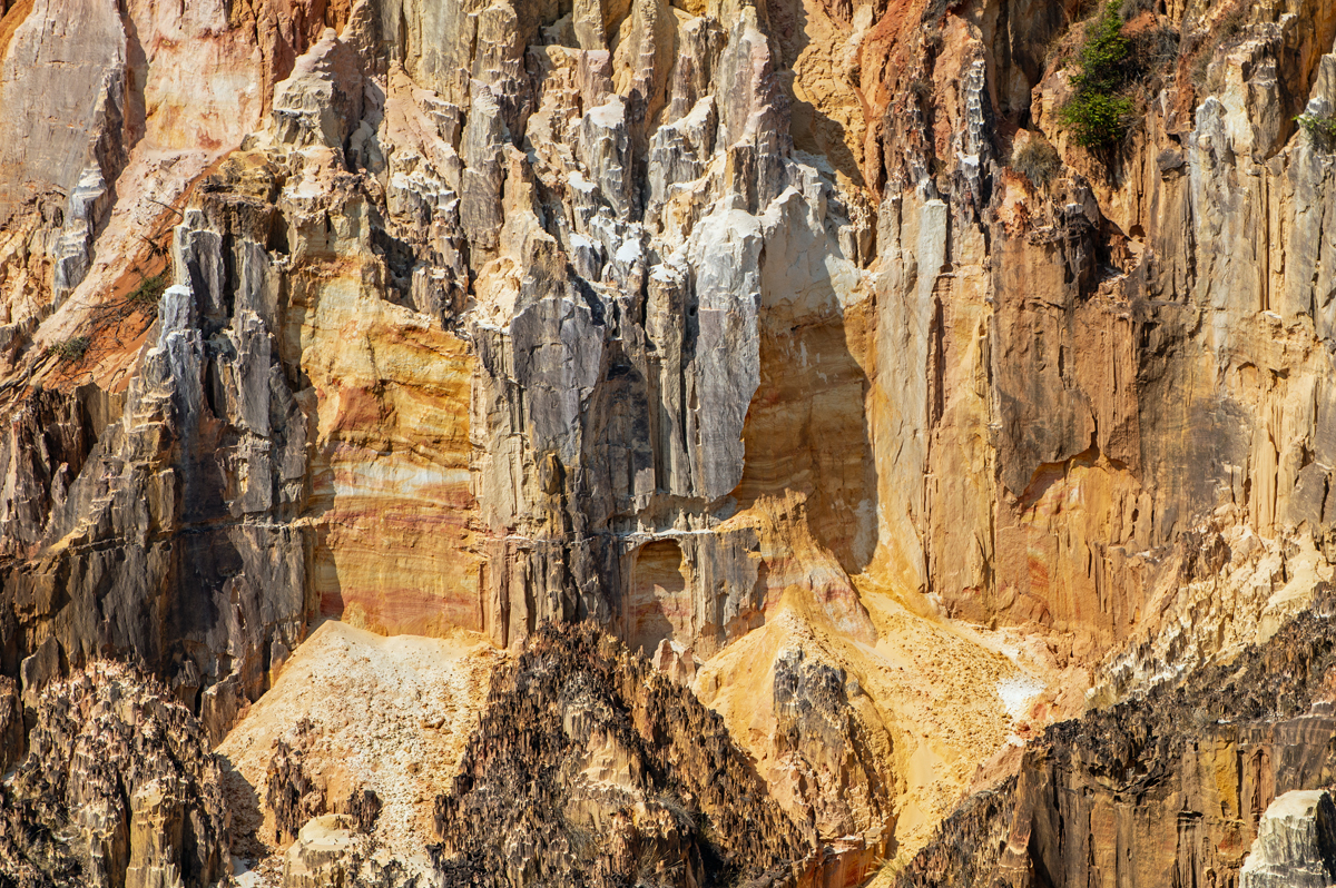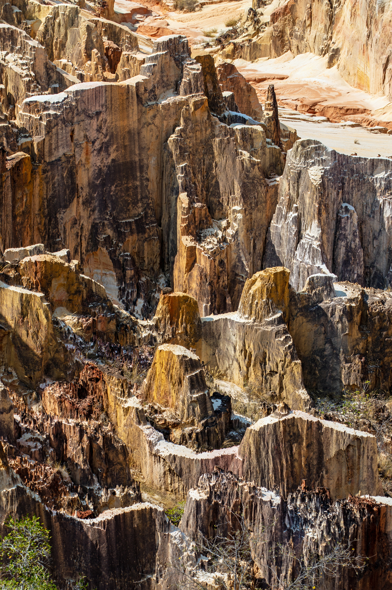 Doch „La Vallée“ ist weniger ein durch einen permanent fließenden Fluss zustande gekommenes Tal als vielmehr eine erosionsbedingte Abbruchkante, wo der Boden, vom Wasser in der Regenzeit unterspült und bar jedes schützenden, tiefer gehenden Wurzelgeflechts, einfach nachgegeben hat und weggebrochen ist. Ein erfahrener Guide, der bereits seit Jahrzehnten in Ankarafantsika arbeitet, erzählte, dass sich das Aussehen des Tals mit jeder Regenzeit ändere. Irgendwann werden diese faszinierenden Formationen vermutlich verschwunden sein. Solange aber wirkt das Tal gleichermaßen wie eine Farb- und eine Formenpalette eines Künstlers. Die verschiedenen Gesteinsarten verwittern unterschiedlich schnell, was zu den bizarren Nadeln und Tafeln führte, die am Ende übrigblieben. Im gut 100 Kilometer entfernt gelegenen Mahajanga nutzen Künstler den bunten Sand der Region, um kunstvolle Bilder in Flaschen zu kreieren – mit den Farben Madagaskars.