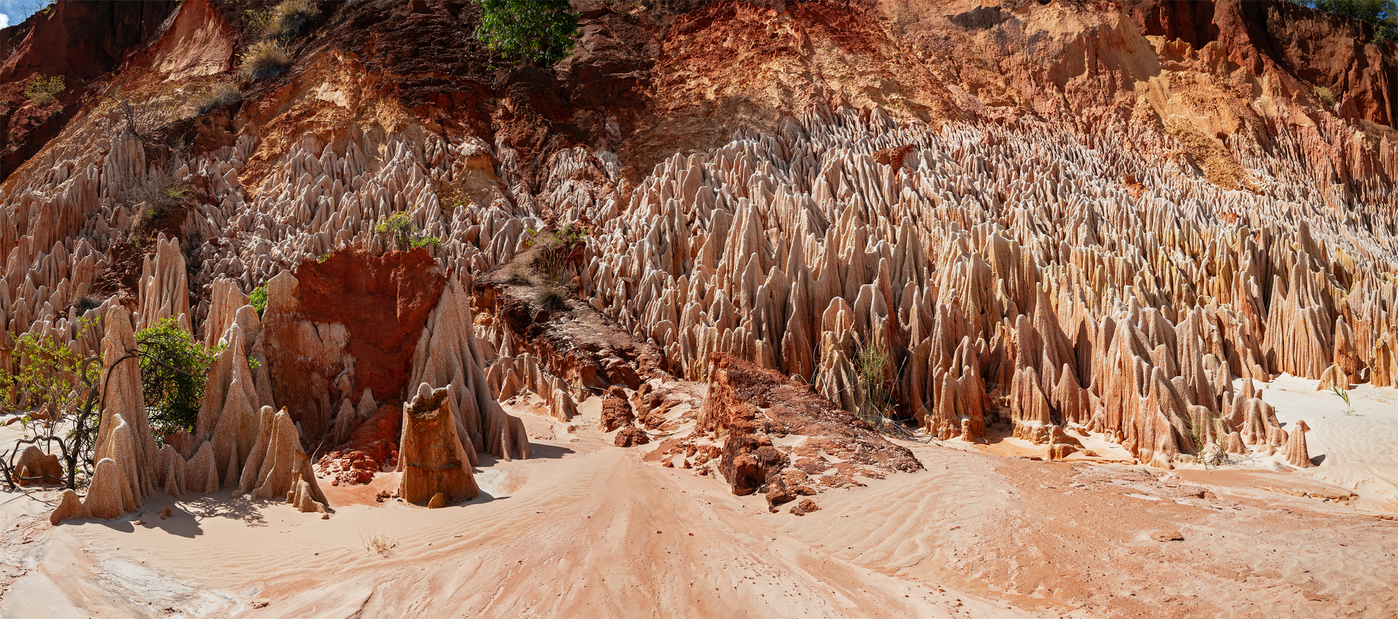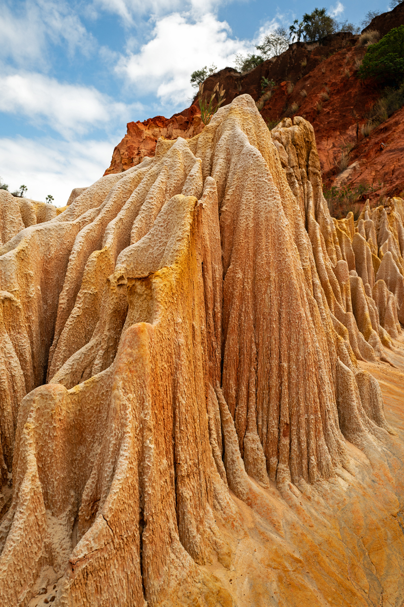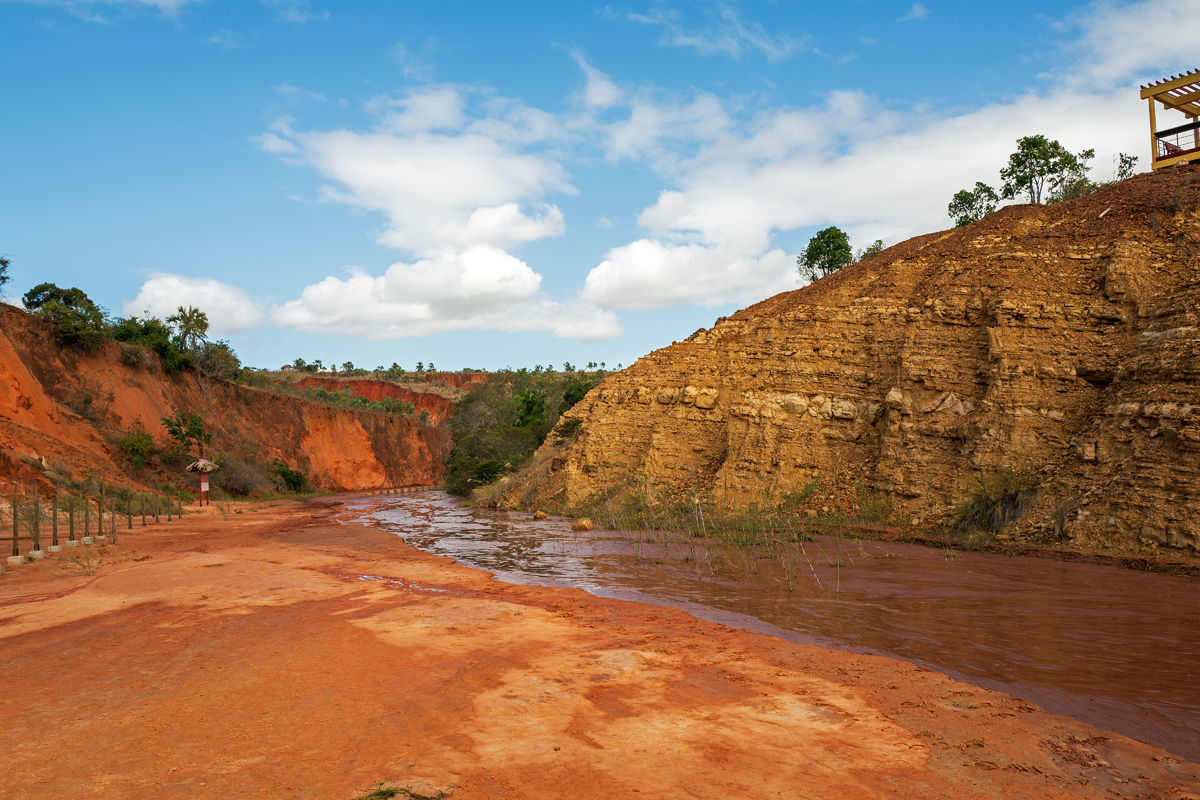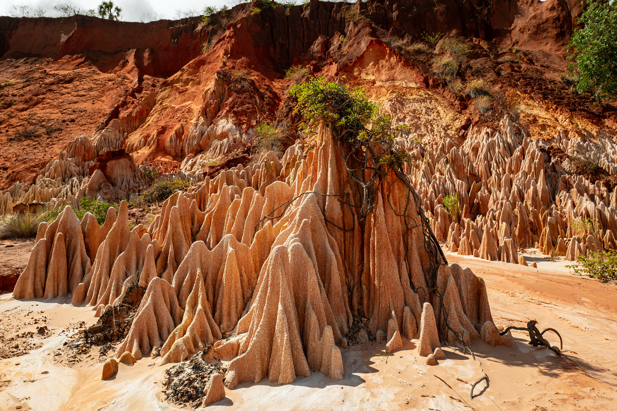 Just like the Cirque rouge near Mahajanga as well as La Vallée at Ankarafantsika National Park, the Tsingy rouge south of Antsiranana (Diego-Suarez) are a product of deforestation and the following erosion. Only recently discovered, this rock formation is changing its looks with every rainy season, and it is very likely that it will be washed away in the future just like its more southerly counterparts. From the top of those rock and sand formations, one can already see the nearby Indian Ocean from where devastating tropical cyclones are approaching the island every beginning of the year. They hit the east coast, nibbling on the shoreline and washing away everything that is not held together by the roots of a healthy vegetation.