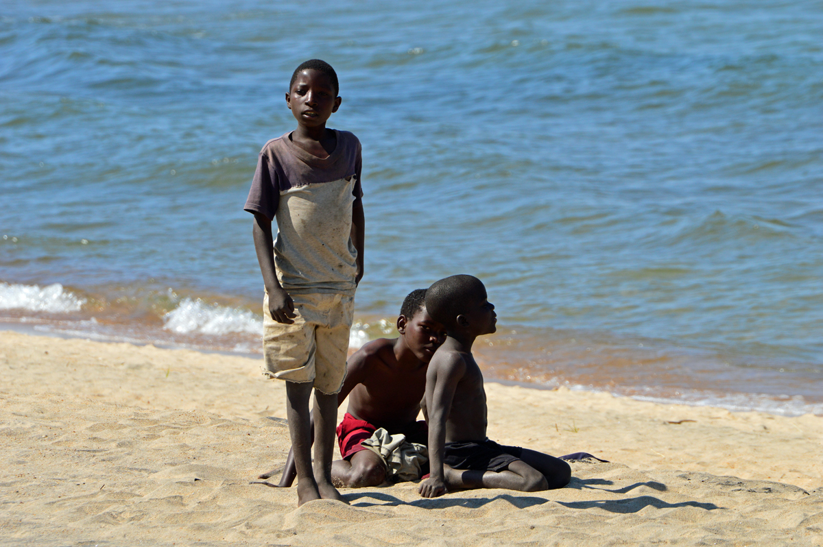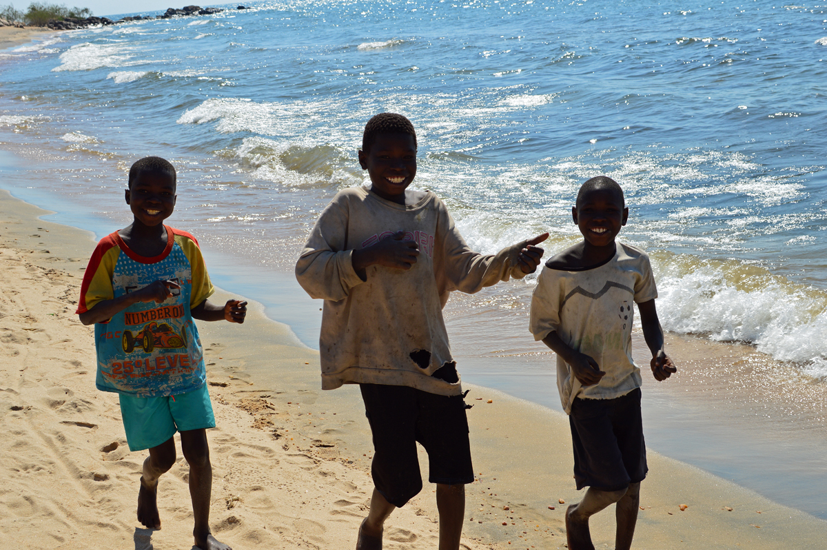 Entlang des Ufers spielt sich alles am Strand ab. Neben Fahrradfahrern erlebten wir Frauen, die die Kleidung der gesamten Familie auf den Steinen wusch, Familien, die am Strand picknickten, Hirten, die ihre Rinder täglich zum Tränken führten, Fischer, die Netze flickten, Fisch trockneten oder ihre Boote reparierten, und nicht zuletzt die vielen Kinder, für die der Strand Heimat bedeutet. Der Strand ist Spielplatz und Heimat gleichermaßen für malawische Waisenkinder. Welch verheerende Schneise HIV, Malaria und andere Krankheiten in die Gesellschaft schlagen, ist schon an der bloßen Menge, die es von ihnen gibt, ersichtlich. In Nkhotakota spielen Kinder aus einem nahen Waisenhaus am Strand.