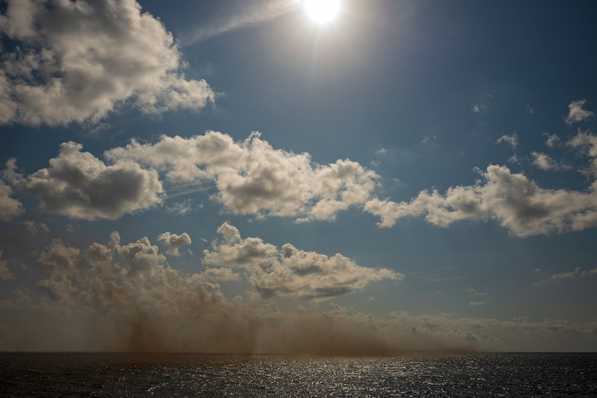 Aber das sollte sich ändern, als eine riesige Wolke direkt vor uns in der Ferne auftauchte. Zu Beginn war sie noch weit weg, aber schon nach ein paar Minuten war ich mir sicher, dass wir direkt durchfahren würden, wenn der Kapitän den Kurs nicht noch änderte. Also verstaute ich sorgfältig meine Nikon, packte mir die Leica mit der 28mm-Linse und stellte mich ganz vorn, direkt neben einer der beiden offenen Türen zur Brücke, auf. Der Kapitän sah mich lächelnd an. Als wir uns der Wolke näherten, begann ich, Fotos zu machen, und realisierte, dass das Ganze viel größer war als ich gedacht hatte. Ich schätzte, dass sich die Wolke auf etwa einen Kilometer Länge bei etwa 100 Metern Breite erstreckte und etwa 30, 40 Meter in die Höhe reichte. Ein oder zwei Minuten später bemerkte ich, wie der Kapitän seine Hand hob, was für seinen Offizier das Zeichen war, beide Türen zu schließen. Unsere Blicke trafen sich erneut, und sein Lächeln war zu einem breiten Grinsen geworden. Alle anderen Passagiere hatten sich mit Decken oder Jacken komplett verhüllt oder waren gleich ins Innere geflüchtet. Als die Fähre in die Wolke fuhr, drehte ich mich bloß um, schob die Kamera unter die Jacke, schlug den Kragen hoch und versuchte zum Ball zu werden. Aber natürlich kamen sie überall hin, auf mir, den anderen Passagieren und überall auf dem Schiff. Aber es war eines der unglaublichsten Erlebnisse, die man sich vorstellen kann.