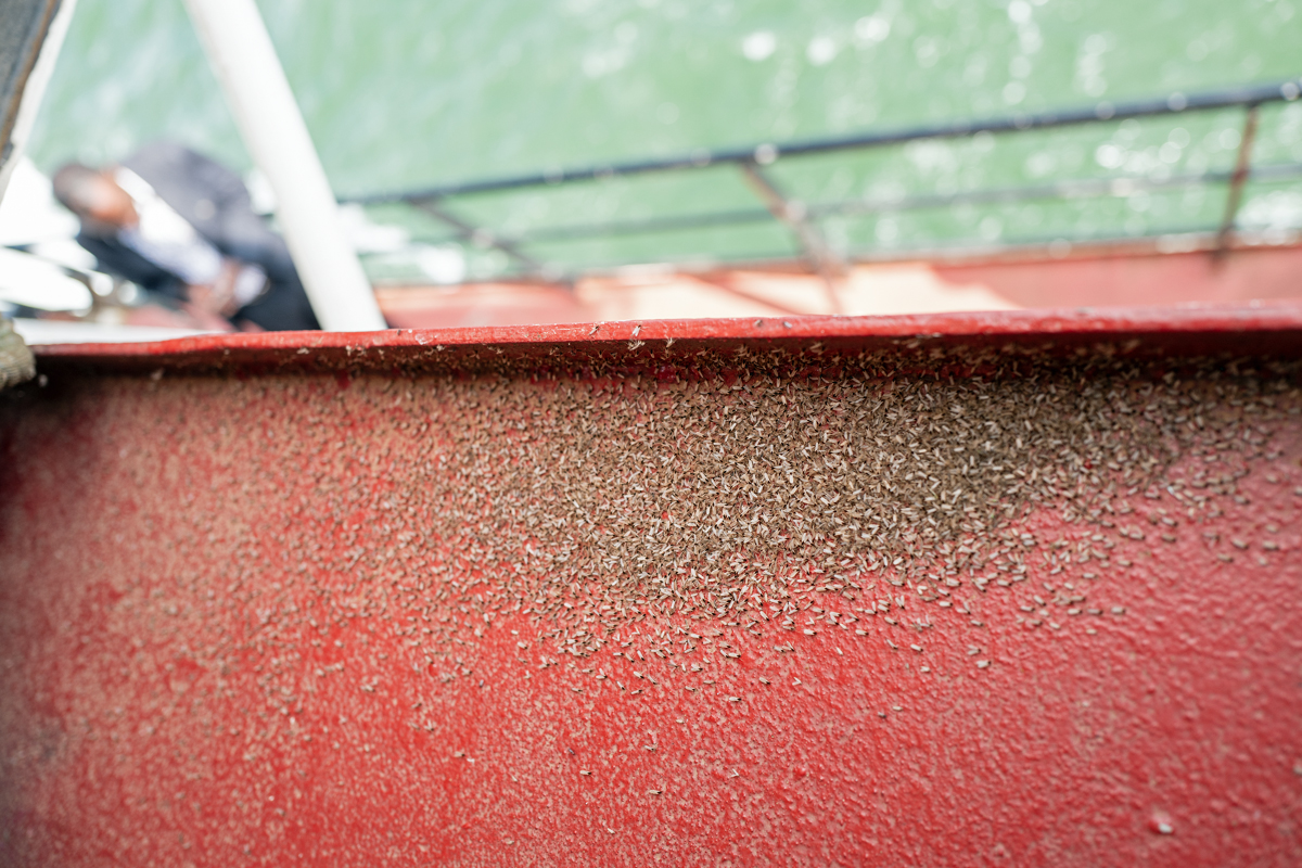 Das ist 2017 anders gewesen. Unser Erstkontakt mit den Zuckmücken hatte schon auf Buggala stattgefunden, wo wir im Inneren zu Abend essen mussten, weil die Außenbeleuchtung des Ssese Island Beach Hotels (SIBH) riesige Schwärme davon anlockte. Die Sache war aber, dass ich dabei überhaupt nicht auf das Victoriasee-Phänomen gekommen war, bis wir – gemeinsam mit Joyce Kikomeku, Besitzerin des SIBH – die Fähre MV Kalangala nach Entebbe nahmen.
