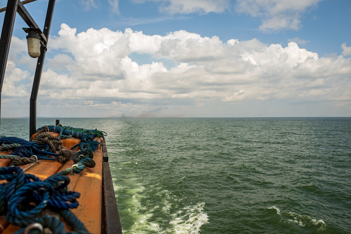 Wir waren auf dem Oberdeck, direkt neben der Brücke. Nachdem wir die nördlicheren Inseln des Ssese-Archipels passiert hatten, konnte ich in der Ferne auf dem offenen See graue Wolken ausmachen – zumindest bildete ich mir das ein. Aber selbst mithilfe meines Tele konnte ich das nicht mit Bestimmtheit sagen. Später tauchten dann andere auf, die tatsächlich als Wolken zu identifizieren waren, aber immer noch ganz leicht Rauchwolken von einem Fischerboot hätten sein können. Die Bilder, die ich davon gemacht habe, waren völlig nutzlos, da ich nicht wusste, worauf ich scharfstellen sollte. Auf den blauen Himmel, auf den blauen See, auf undefinierbare graue Wolken?