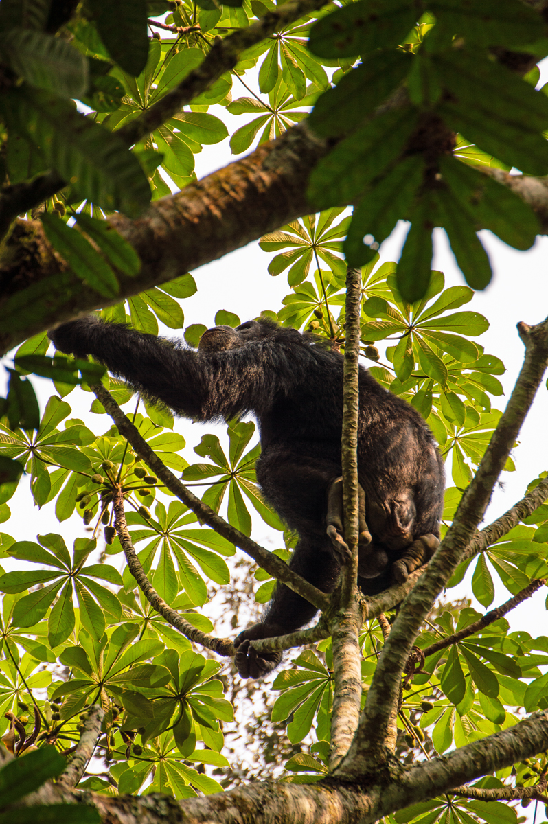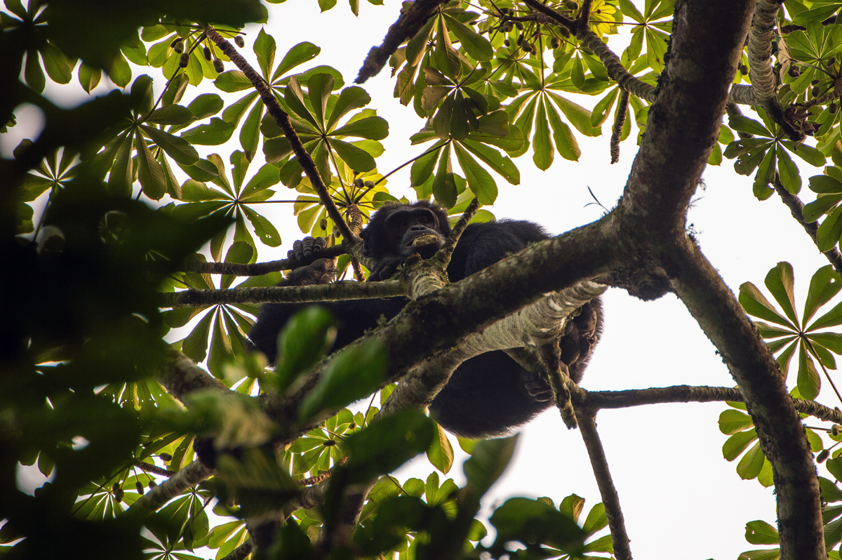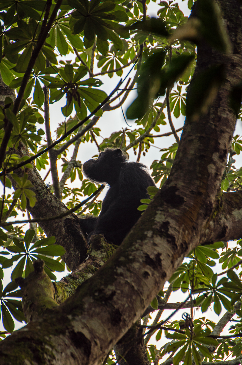 Der Guide brachte uns zu den Trackern, die schon früh am Morgen in den Wald aufbrechen und die Tiere suchen. Denn Schimpansen kommen in der Regel erst abends und für die Nacht zusammen, tagsüber teilen sie sich auf, um nach Futter, wie Früchten, zu suchen. Dabei durchstreifen sie große Gebiete und bleiben mithilfe markerschütternden Geschreis untereinander in Kontakt. Sie aber im zum Teil 20 oder 30 Meter hohen Blätterdach zu finden, ist gar nicht so einfach. Wir stießen auf das Alphamännchen der Gruppe und ein weiteres, rangniederes Männchen, die gerade frisches Obst frühstückten. Ihre erstaunlich massigen Körper wirkten wie eine verkleinerte Version eines Bodybuilders: jede Faser war definiert, in Bewegung rollten ihre Muskelpakete wie Bowlingkugeln unter der Haut hin und her, weshalb sie den Eindruck von kleinen Türstehern vermittelten, mit denen man sich besser nicht anlegt.