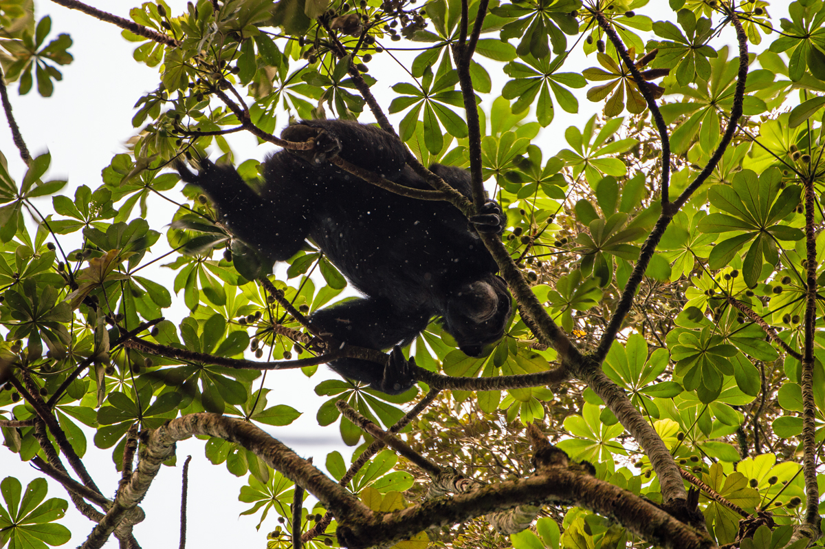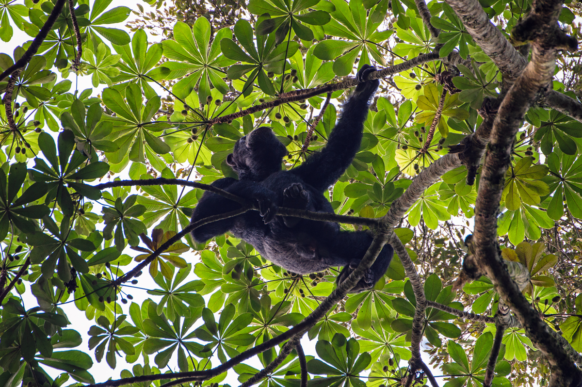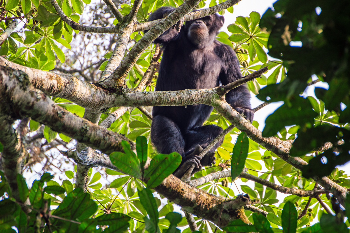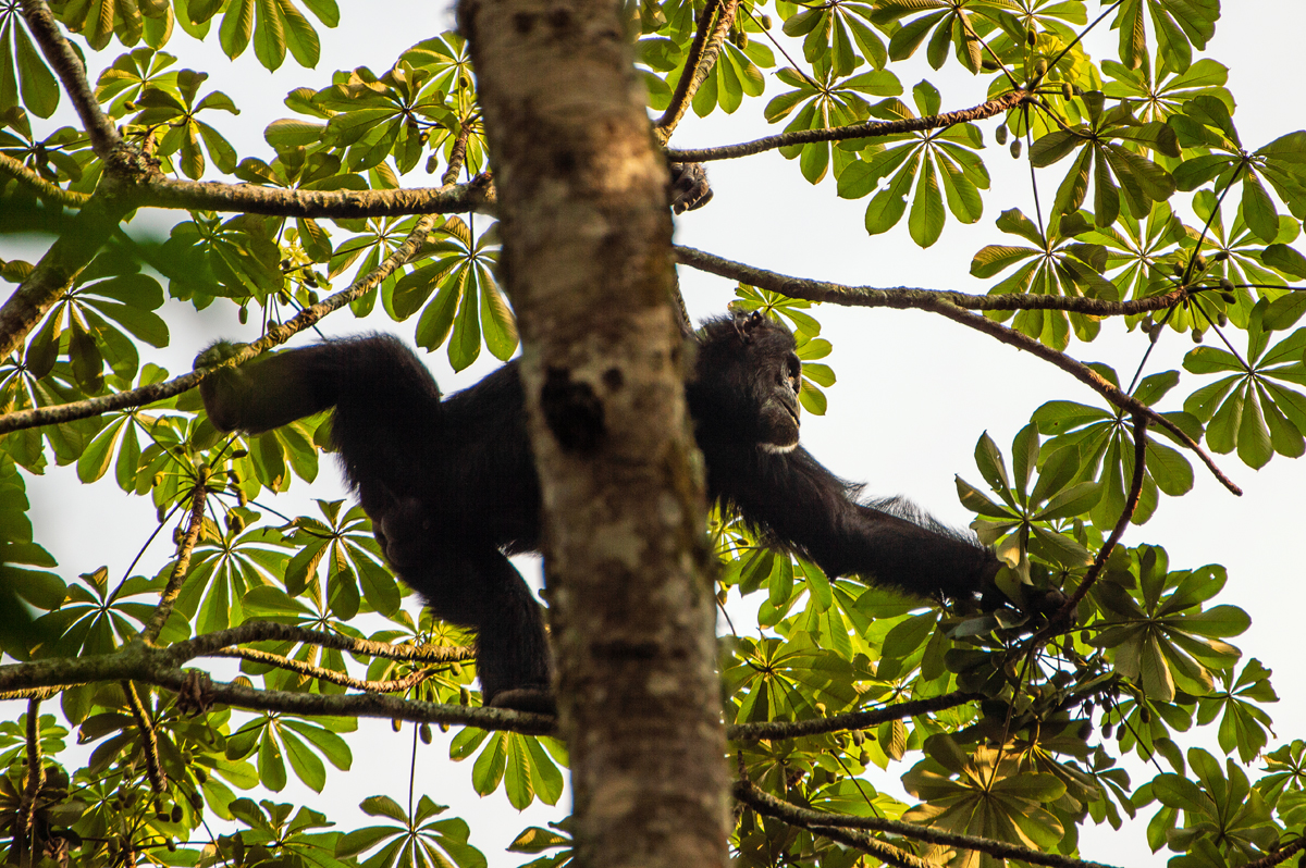 Der Guide brachte uns zu den Trackern, die schon früh am Morgen in den Wald aufbrechen und die Tiere suchen. Denn Schimpansen kommen in der Regel erst abends und für die Nacht zusammen, tagsüber teilen sie sich auf, um nach Futter, wie Früchten, zu suchen. Dabei durchstreifen sie große Gebiete und bleiben mithilfe markerschütternden Geschreis untereinander in Kontakt. Sie aber im zum Teil 20 oder 30 Meter hohen Blätterdach zu finden, ist gar nicht so einfach. Wir stießen auf das Alphamännchen der Gruppe und ein weiteres, rangniederes Männchen, die gerade frisches Obst frühstückten. Ihre erstaunlich massigen Körper wirkten wie eine verkleinerte Version eines Bodybuilders: jede Faser war definiert, in Bewegung rollten ihre Muskelpakete wie Bowlingkugeln unter der Haut hin und her, weshalb sie den Eindruck von kleinen Türstehern vermittelten, mit denen man sich besser nicht anlegt.