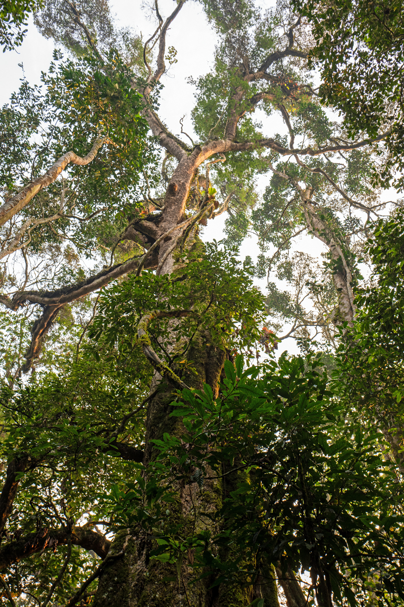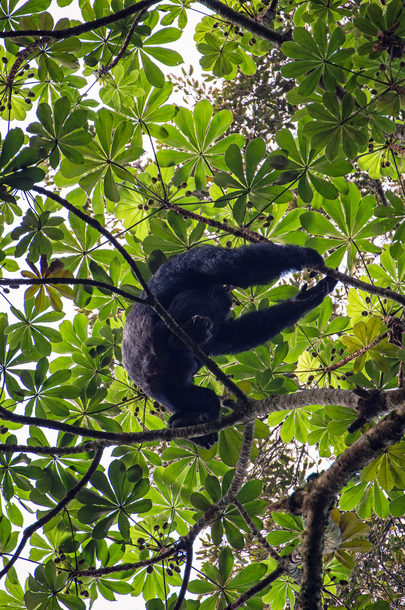 Im Geäst bewegten sie sich keineswegs grazil, eher verschlafen, taumelnd, lässig. Besonders das Alphamännchen, das irgendwo in einer Astgabel hockte und sich die Äste mit den Früchten nicht gerade behutsam und oftmals knackend in Reichweite zog und, wenn alles verputzt war, sie mit lautstarkem Rauschen wieder zurückschnellen ließ. Während ich überglücklich Nackenstarre bekam und meine Muskulatur irgendwann aufgrund der Kamera mit dem großen Tele, die ich quasi dauerhaft über dem Kopf hielt, anfing zu brennen, schleppte sich der Schimpanse direkt über mir auf einem Ast von einem Baum zum anderen. Dabei schüttelte er den Tau von den Blättern, der auf mich niederregnete. Erst, als sie genug von den Früchten und uns hatten und in der Ferne die Schreie anderer Gruppenangehöriger lockten, wurden sie plötzlich zu den kraftvollen, agilen und sich präzise bewegenden Wildtieren, die man gemeinhin erwartet. Innerhalb weniger Augenblicke kamen sie direkt neben mir die Stämme herunter, was sie vor allem tun, wenn sie schnell längere Strecken bewältigen wollen. Mit einem kurzen Rascheln tauchten sie ein ins Unterholz, und schon waren sie verschwunden.