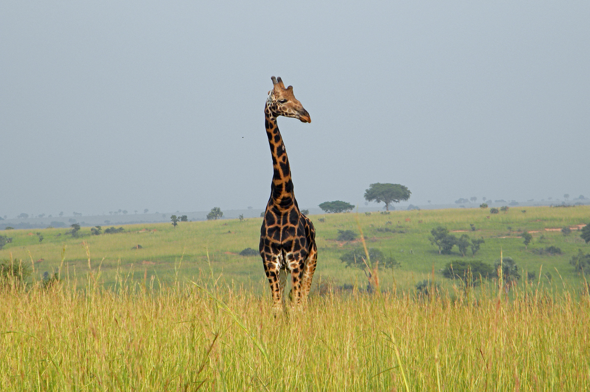 Die Uganda- oder Rothschild-Giraffe ist in freier Wildnis nahezu ausgestorben. Obwohl sie ursprünglich in großen Gebieten in Uganda, Sudan und Kenia zu Hause gewesen ist, kommt sie heute nur noch im Murchison Falls National Park und im Kidepo Valley NP in Ost- und Norduganda sowie im Lake Nakuru NP in Kenia vor. Dabei handelt es sich um mit bis zu sechs Metern Höhe eine der größten und eine auffallend schöne Giraffen-Art. Vor allem bei den Bullen sticht der Kontrast zwischen der hellen Grundfarbe und einem fast schwarzen Muster besonders hervor.