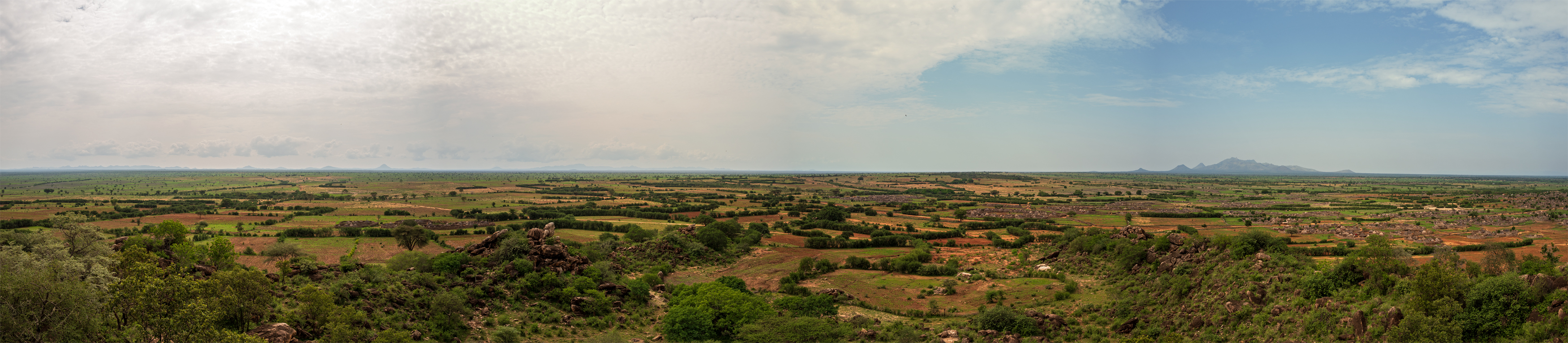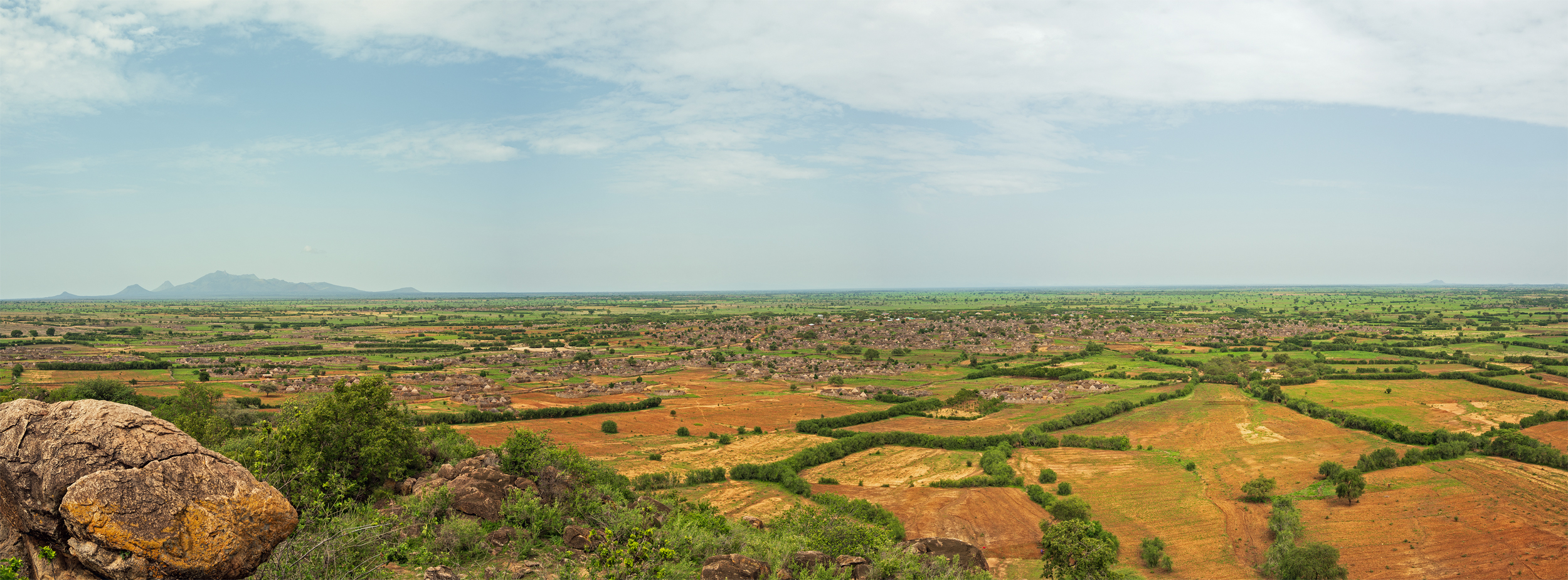 Wir bestiegen einen Hügel mit großen Felsen auf der Spitze. Oben erzählte uns der stets gut gelaunte Joseph, wie er als junger Hirte unter einen überhängenden Stein gekrochen war, um Schutz vor Regen zu suchen. In der Ferne war ein Bergzug zu erkennen, der laut Joseph bereits in Kenia liegt. Dorthin hat er früher zu dieser Zeit des Jahres die Rinder getrieben, weil dort selbst bei Dürre noch Wasser und frisches Gras für die Rinder zu finden sei. Später in seinem Leben ist er bis in den Südsudan und in die Turkana-Senke in Kenia gewandert, um Handel zu treiben, bis ihm die Lage im Südsudan schließlich zu gefährlich geworden war. Weil zur gleichen Zeit die Entwaffnungsprogramme in seiner Heimat zu greifen begannen, ließ er sein traditionelles Leben hinter sich und begann ein neues als Reiseführer.