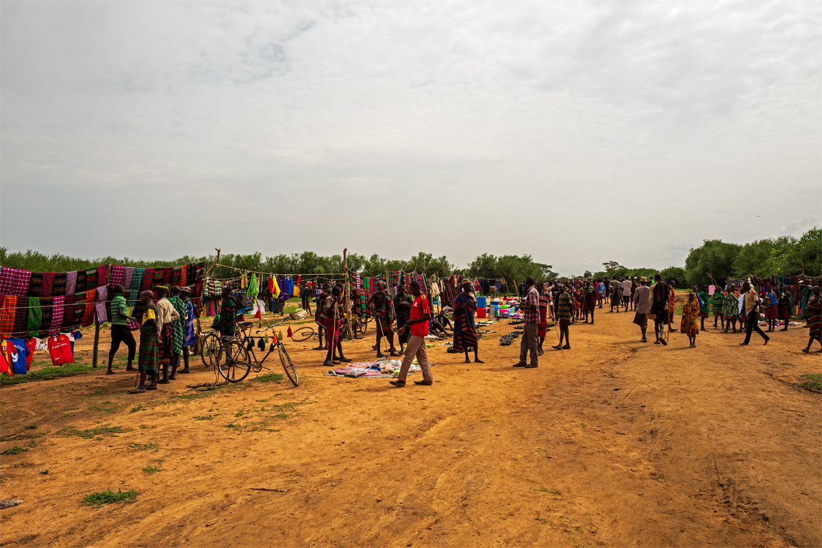 Anschließend schauten wir noch auf dem Markt vorbei, für den es eigentlich schon ein wenig spät war. Aber soweit ich das einschätzen kann, haben die Menschen, die noch auf dem Markt unterwegs waren, ihre Meinung darüber, wie langweilig dieser Markttag war, noch einmal revidiert, als wir kamen. Wie alle Menschen auf der Welt sind auch die Karamojong gespalten in die Mach-ein-Foto-von-mir-ich-bin-der-Tollste- und die Verpiss-dich-Fraktion, wenn es ums Fotografieren geht. Die Älteren grüßten freundlich, aber gelassen, da sie Mzungu-Besuche schon erlebt hatten. Bei den Jungen lag die Sache anders. Die jungen Männer versuchten, cool zu wirken, und ich konnte dem einen oder anderen ansehen, dass er genervt davon war, dass wir plötzlich im Zentrum des Interesses der jungen Frauen standen, die zumeist einfach vor Neugier auf die Mzungus zu platzen drohten. Darüber hinaus schienen sie alle extrem stolz darauf zu sein, dass wir Interesse an ihnen und ihrer Kultur zeigten. Und selbst einige junge Männer wollten, dass ich ein Bild von ihnen mache – professionelles Posieren eingeschlossen.