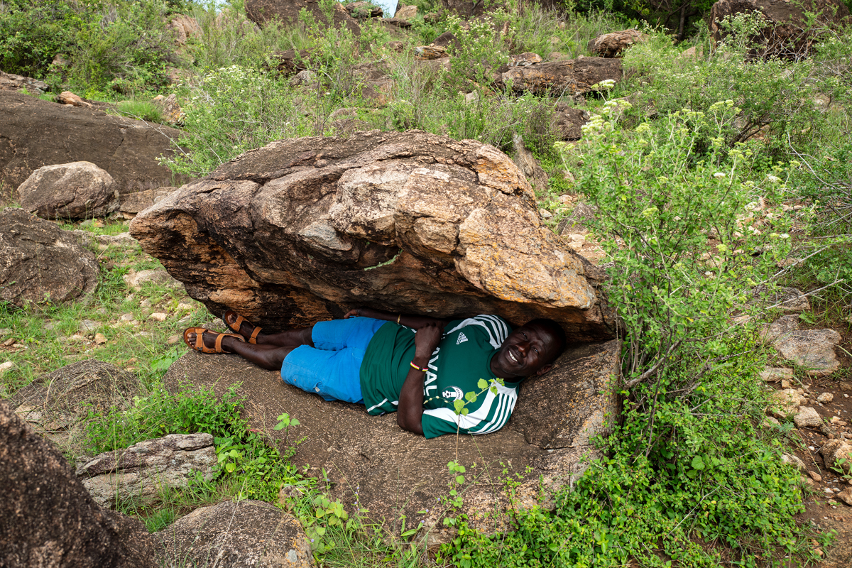 We climbed a hill with big boulders on top, and Joseph – always in a good mood – told us how he used to crawl under a small rock to seek shelter from the rain when he was a young herdsman. In the far distance, we could see a mountain range, already on the Kenyan side of the border, Joseph explained. That was the direction he went looking for fresh grass, because there is always some water near the mountains, which means food for the cattle. Later in his life, he wandered to South Sudan and to the Turkana region in Kenya for trading but then, the situation in South Sudan became worse and worse while in Uganda, disarmament programmes started having an effect. So, he quit the traditional life and started a new one as a guide.