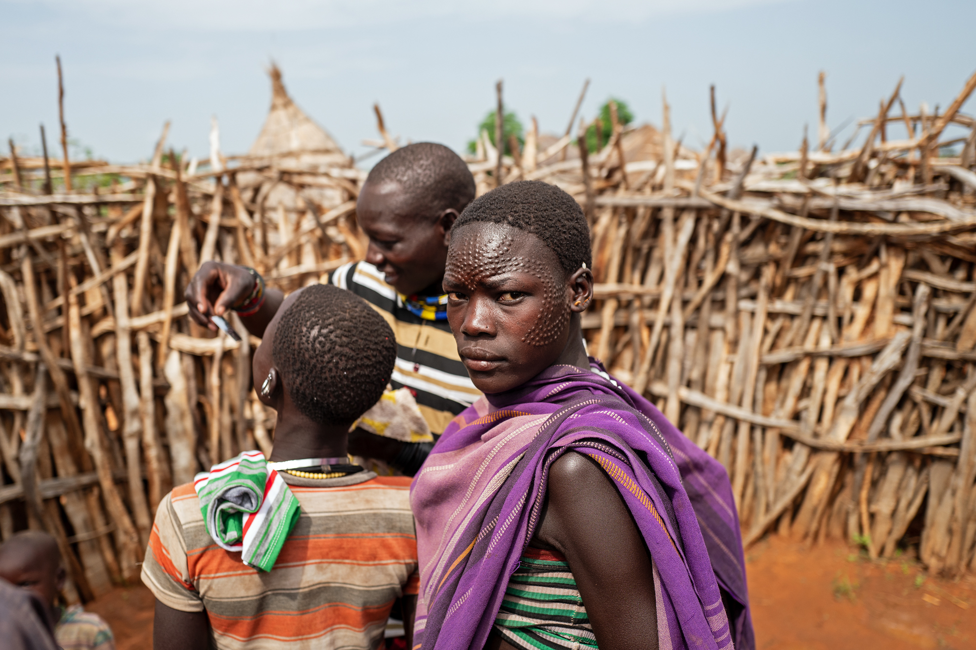 Erst unter Idi Amins Herrschaft wurden die Karamojong gezwungen, Kleidung anzulegen. Heute tragen sie ganz ähnliche Stoffe wie die verwandten Massai in Kenia. Hauptsache bunt und gern kariert! Nichtsdestotrotz spielt Kleidung keine große Rolle in ihrer Kultur, weshalb sie häufig auch eher nachlässig getragen wird. Dagegen ist ihnen Körperschmuck extrem wichtig, von Armreifen und Halsketten über Ringe und Piercings bis hin zur Skarifizierung. Mithilfe von Dornen oder Rasierklingen durchstechen oder ritzen sie die Haut und kreieren auf diese Weise faszinierende Muster. Sie stechen gebogene Dornen unter die Haut und ziehen sie mit einem Ruck heraus. Danach wird Holzkohle in die Wunde gerieben, und die anschließende leichte Infektion hinterlässt am Ende eine schöne punktförmige (oder im Falle der Rasierklinge eine kurze linienförmige) Narbe. Nach ein paar Hundert Wiederholungen hat man dann ein komplettes Muster.
