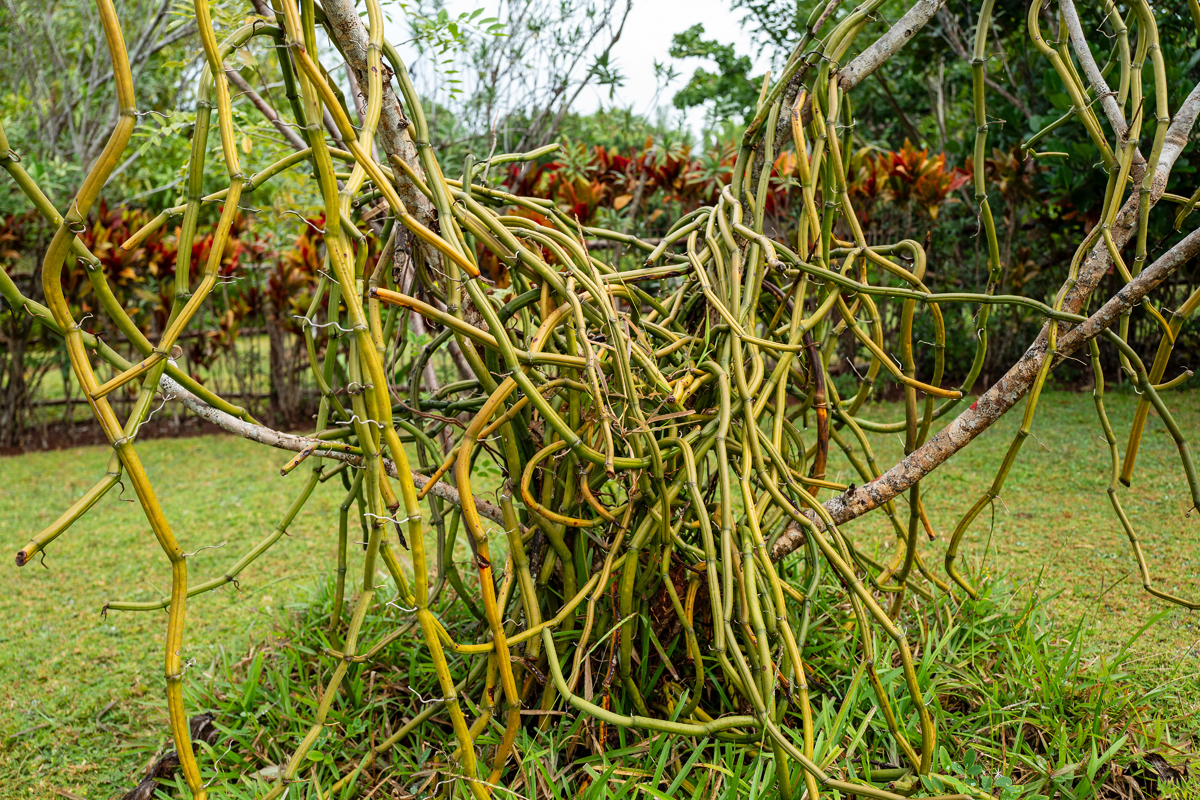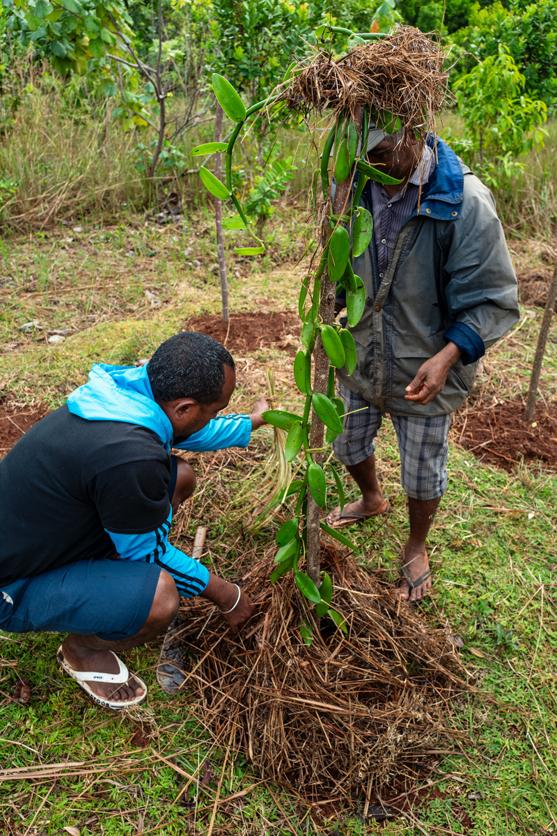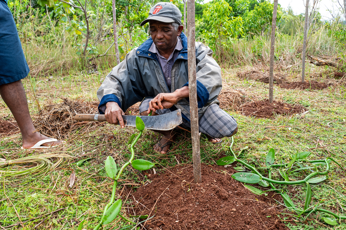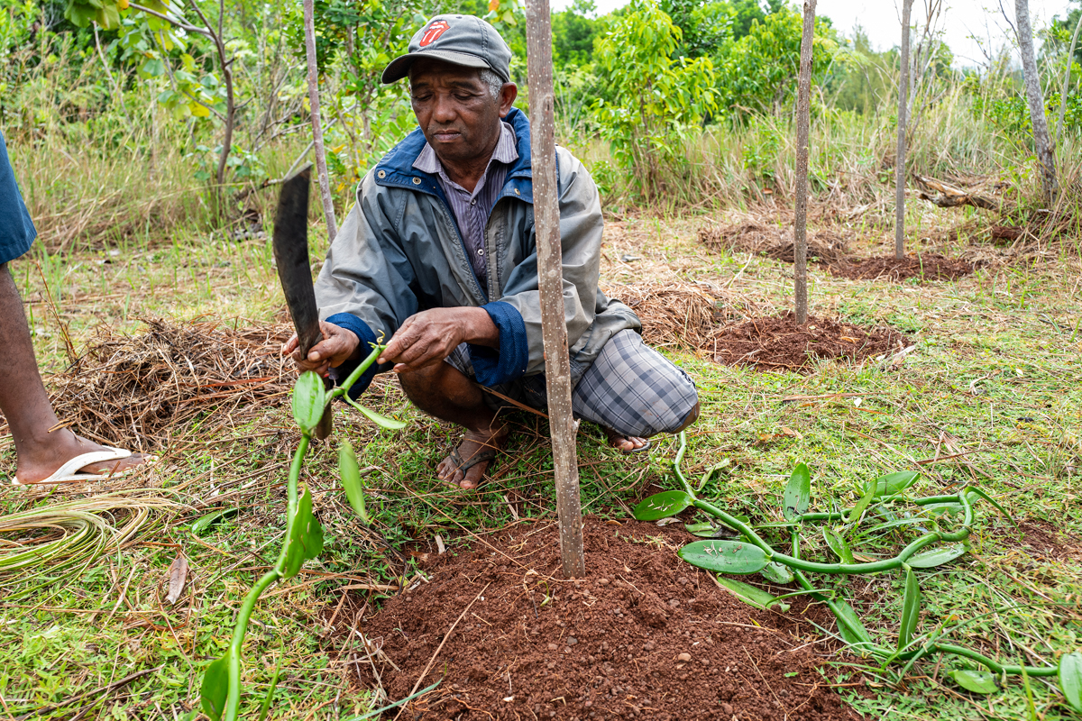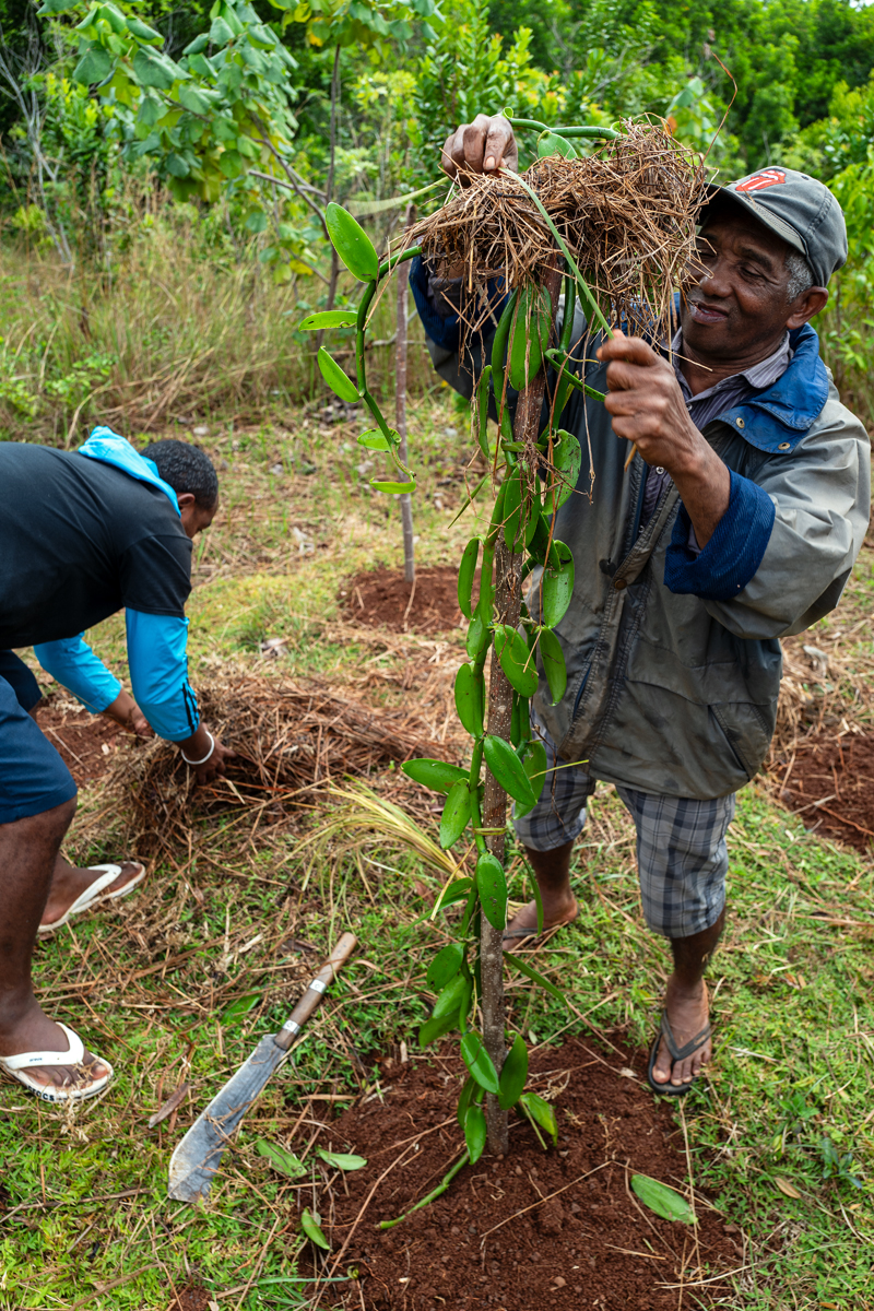 Nach einer haarsträubenden Erfahrung mit einem EU-Programm, in dessen Rahmen man im großen Stil Bäume fällen musste, um Platz für mehr Vanille zu schaffen, verlor man drei Jahre später die erste Ernte in einem verheerenden Zyklon. 86.000 Pflanzen wurden vernichtet. Die Vanille-Orchidee benötigt nämlich drei Jahre, nachdem die Ranken auf Stämme oder kleine Bäume aufgepfropft wurden, wo sie ihre Luftwurzeln zur Nährstoffversorgung nutzen, bevor sie die ersten so genannten Schoten ausbildet. Zyklone treffen die Region allerdings jedes Jahr, und es wird aufgrund des Klimawandels und des daraus entstehenden Wetters im Anthropozän immer schlimmer. Seither hat man unzählige Bäume gepflanzt, die nun wieder Schatten in der Sonne und Schutz vor Zyklonen bieten.