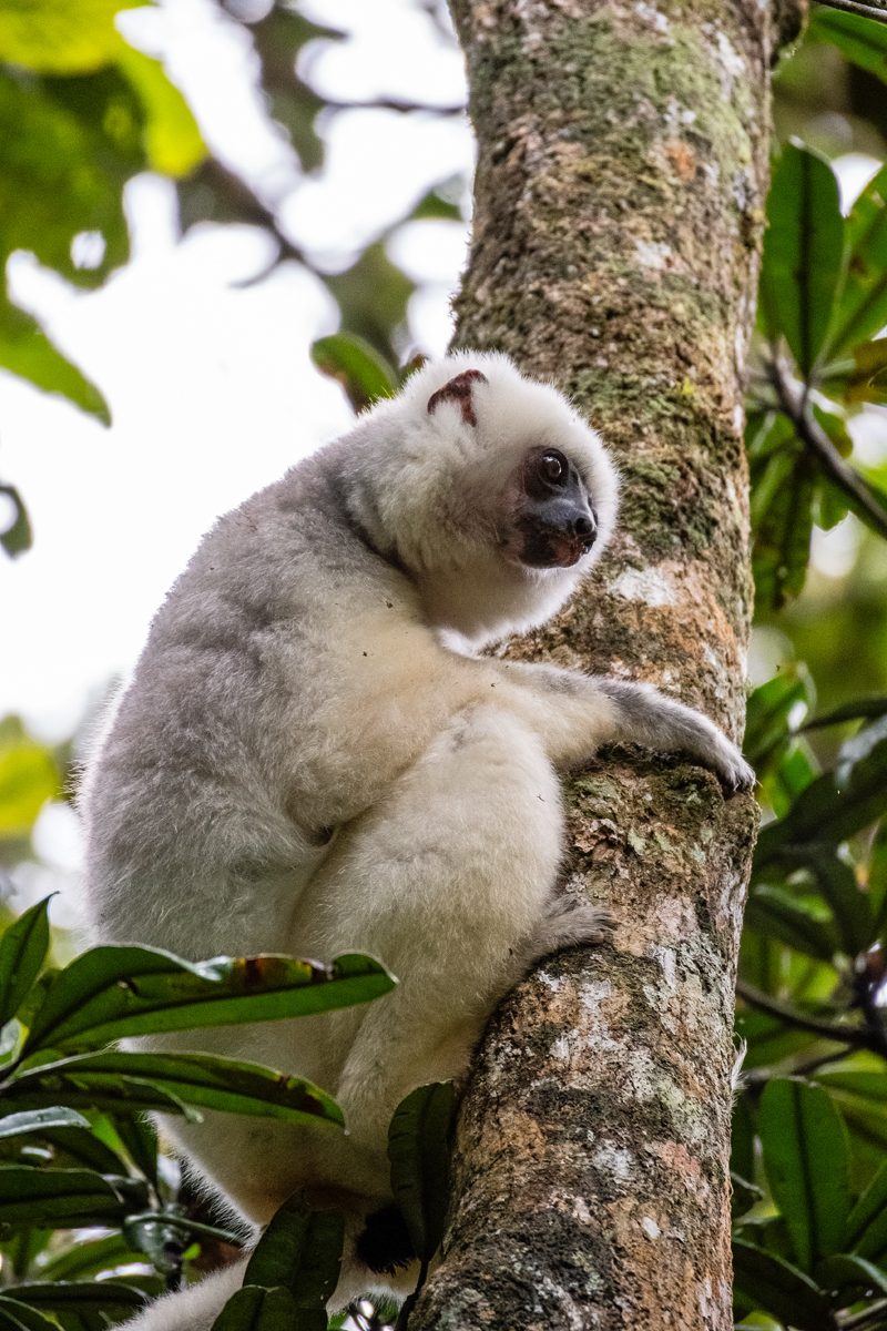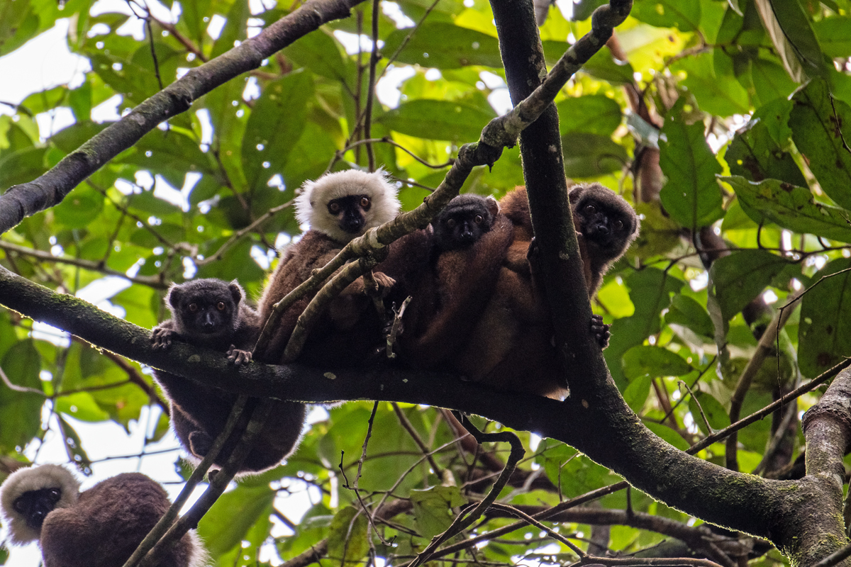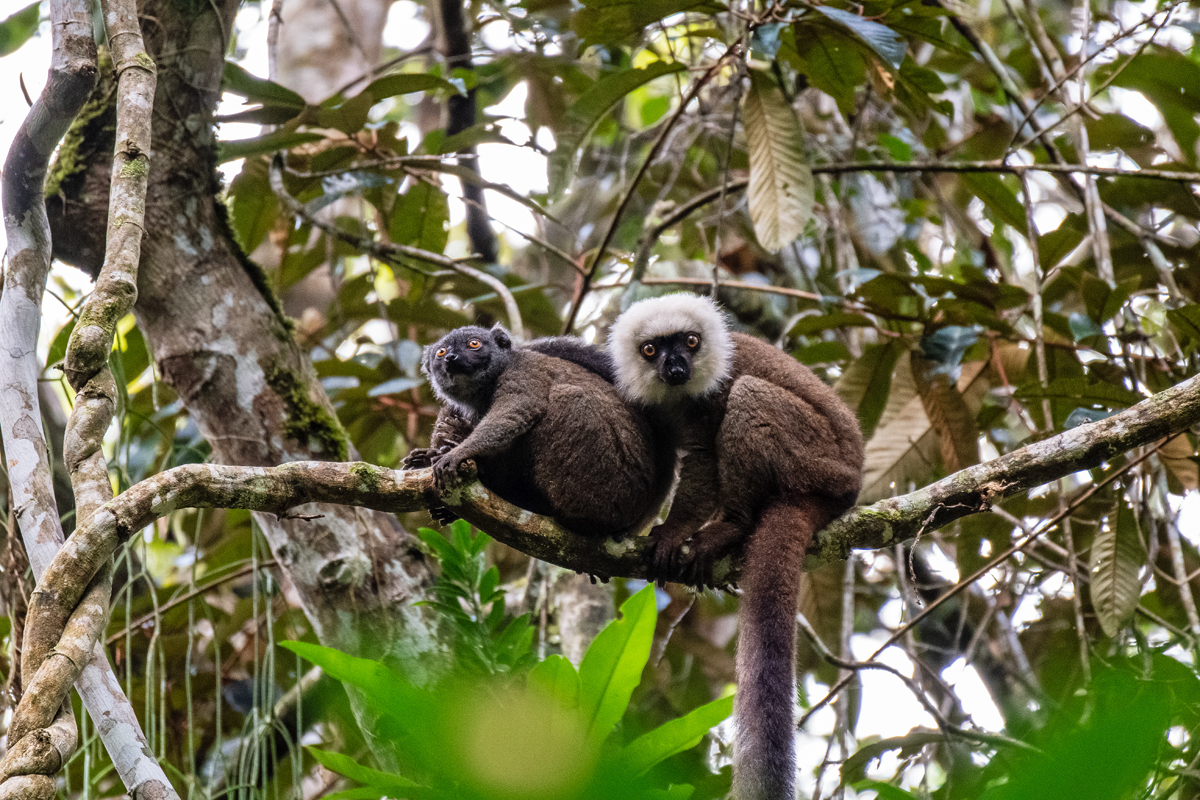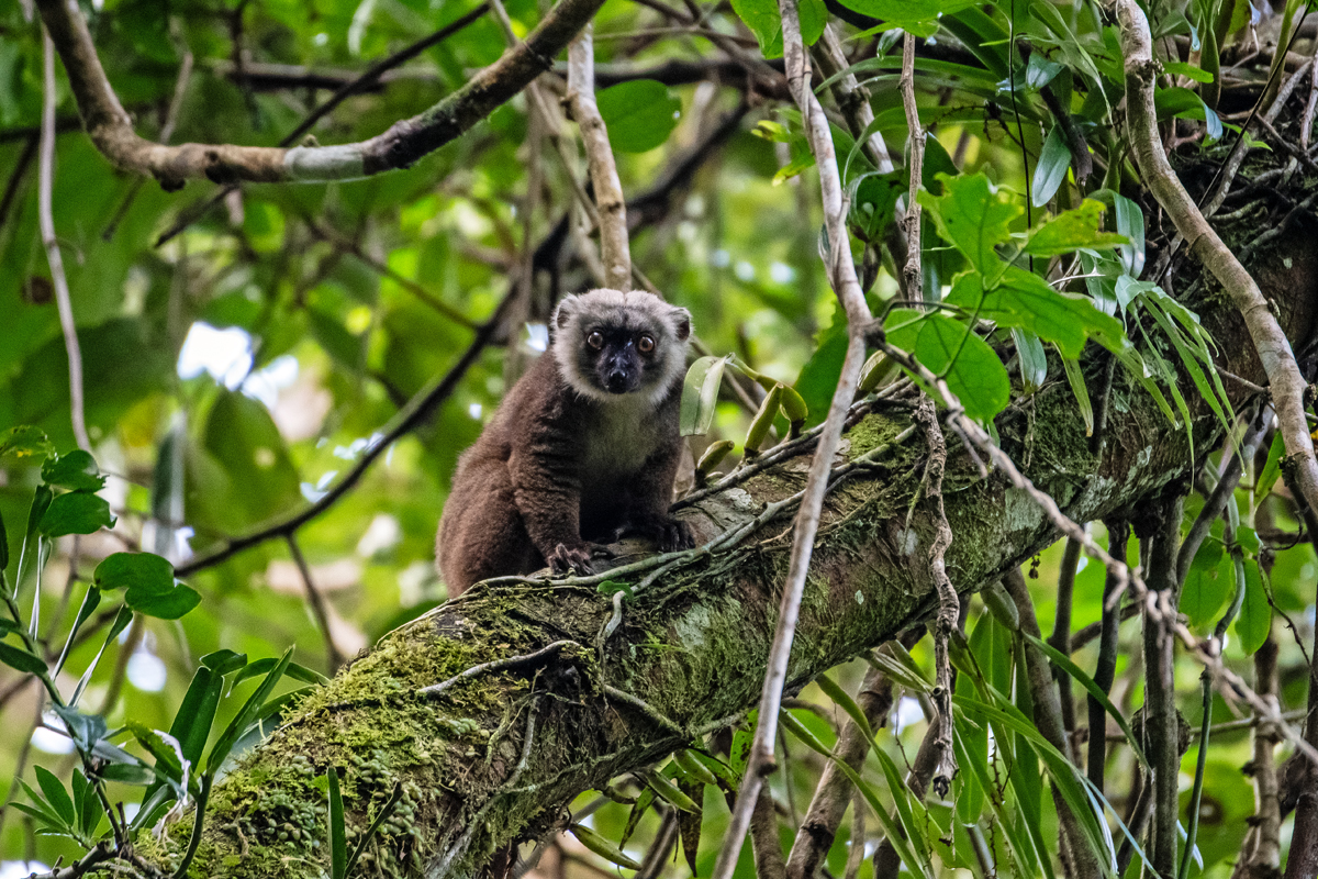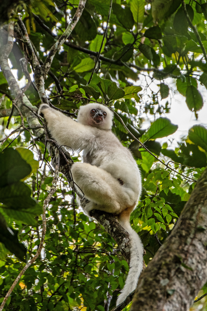 Die Wanderung vom Camp Mantella hinauf zum Camp Marojejya auf 775 m ist ein wenig anstrengender, als ob man eine Wendeltreppe aus Pudding hinaufzuklettern versucht. Hin und wieder gibt es Seile, Trittsteine oder sogar ein paar Stufen, dann wieder muss man nach der nächsten Wurzel, einem Ast oder was auch immer dem eigenen Gewicht standhält greifen. Wie ich bereits erwähnte, ist man immer noch, oder wieder, nass, matschig, man schwitzt und wird eine Minute später von einem tropischen Regenguss durchnässt. Aber im Gebiet des Camp Marojejya findet man mithilfe der Tracker vielleicht Seidensifakas. Sie gehören zu den am stärksten vom Aussterben bedrohten Primaten auf der Welt mit heute noch 249 erwachsenen verbliebenen Tieren, laut IUCN. Die Einheimischen nennen sie Engel des Waldes. Darüber hinaus ist das Gebiet das Zuhause von Weißkopfmakis und Unmengen an Chamäleons.