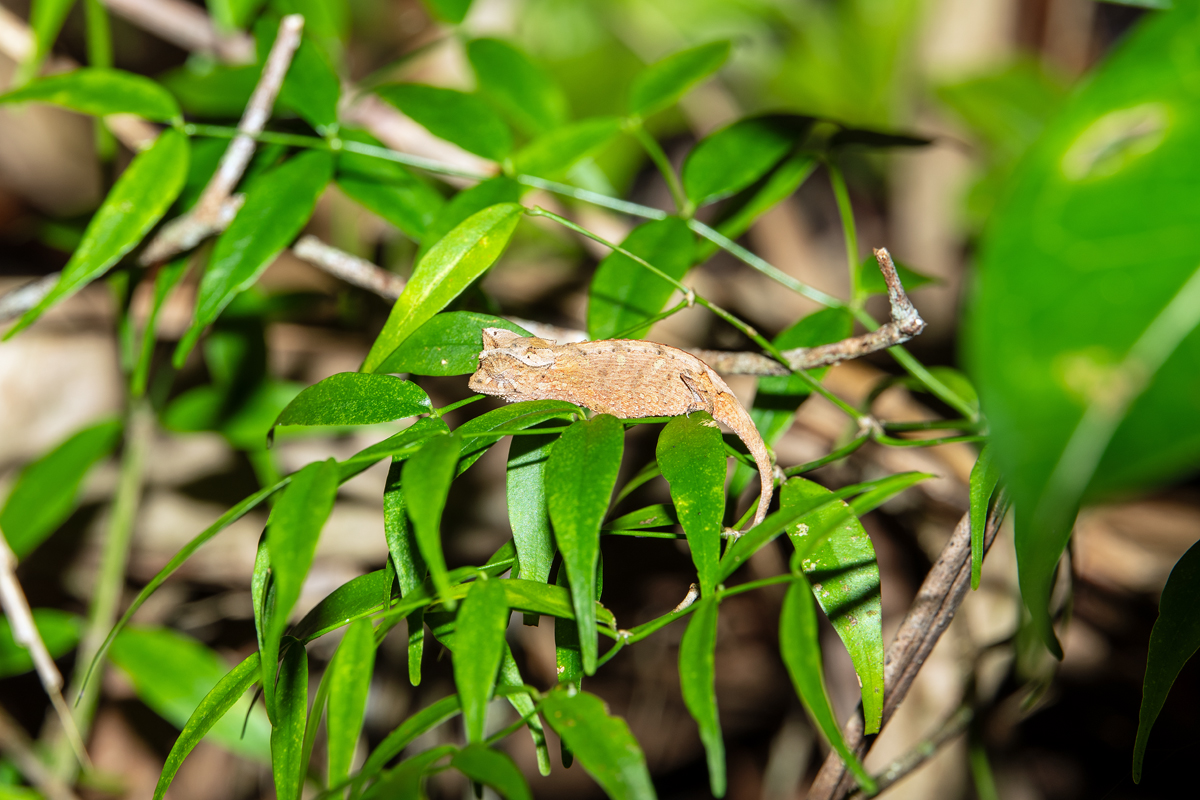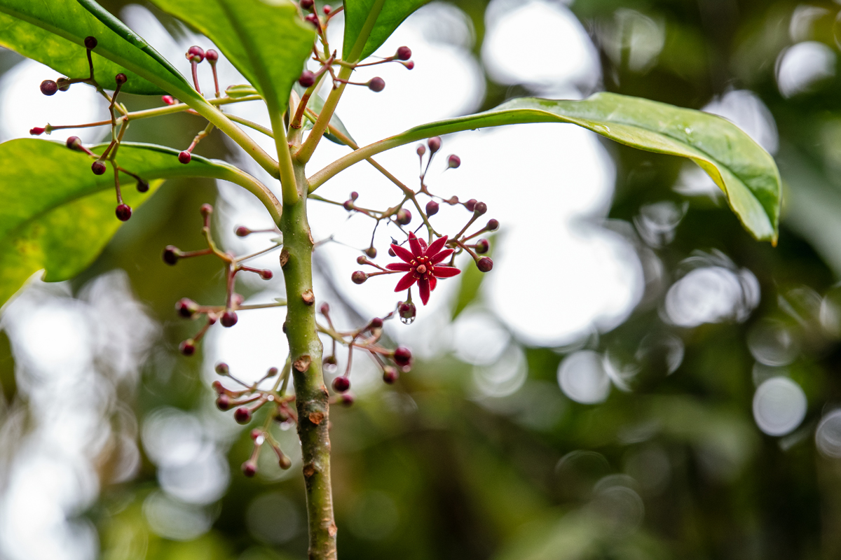 Der heimliche Star des Parks ist Takhtajania perrieri, eine strauchartige Pflanze mit wunderschönen roten sternenförmigen Blüten. Sie wird auch als Dinosaurier-Pflanze bezeichnet, weil diese Art bereits seit 120 Millionen Jahren auf der Erde wächst. Es war eine der ersten, die Blüten ausbildete, und ihre Zellen können noch kein Wasser speichern, weshalb sie nur in stabil feuchter Umgebung über 1.000 m Höhe gedeiht. Wir fanden ein Exemplar zusammen mit Yockno, dem Präsidenten der Guide-Vereinigung von Marojejy, der Takhtajania perrieri anhand des bitteren Geschmacks der Blätter identifizieren konnte. Die Guides wissen von einer weiteren Stelle mit Takhtajania im nahe gelegenen Anjanaharibe-Sud Spezialreservat, eine dritte im Marojejy Nationalpark ist zwischen 2021 und 2022 verschwunden. Wenn es aufgrund des Klimawandels trockener wird, wird Takhtajania in ein paar Jahren ganz verschwunden sein. Und das ist erst der Anfang.