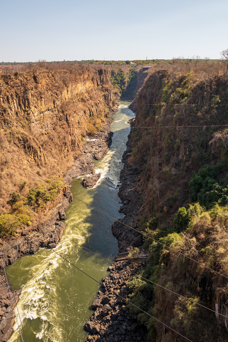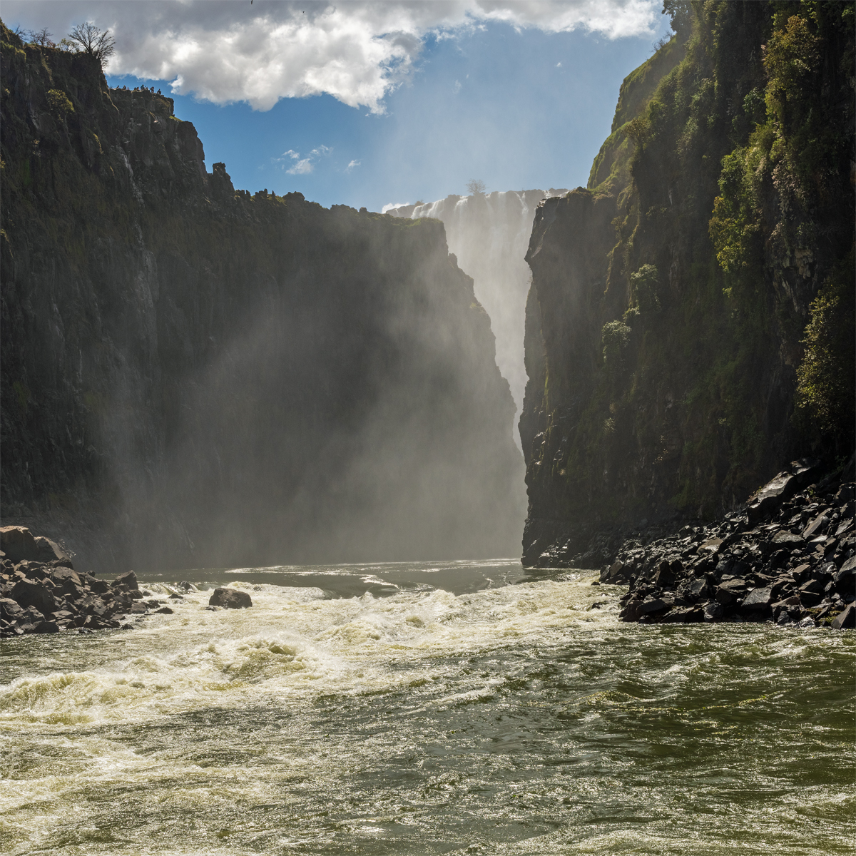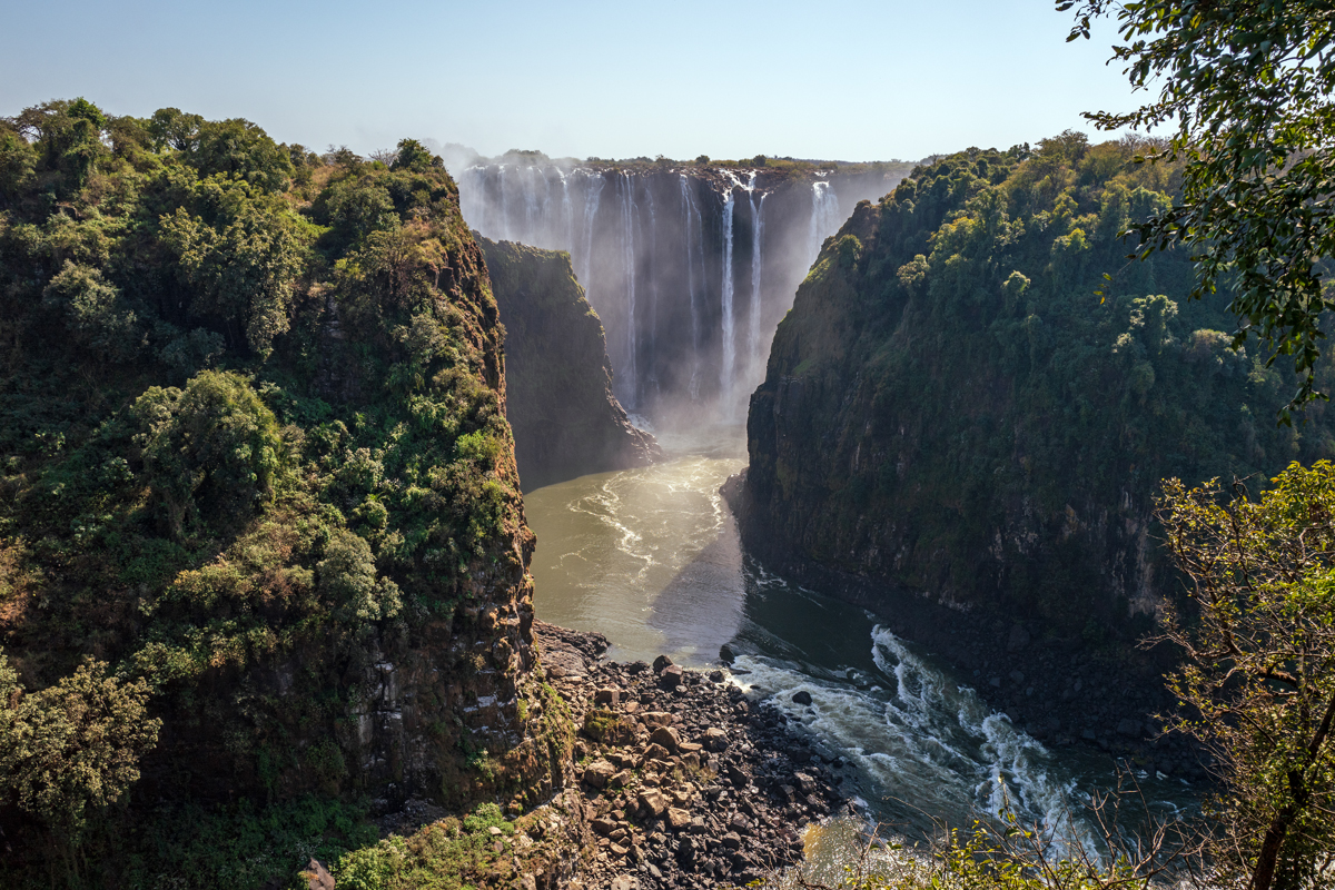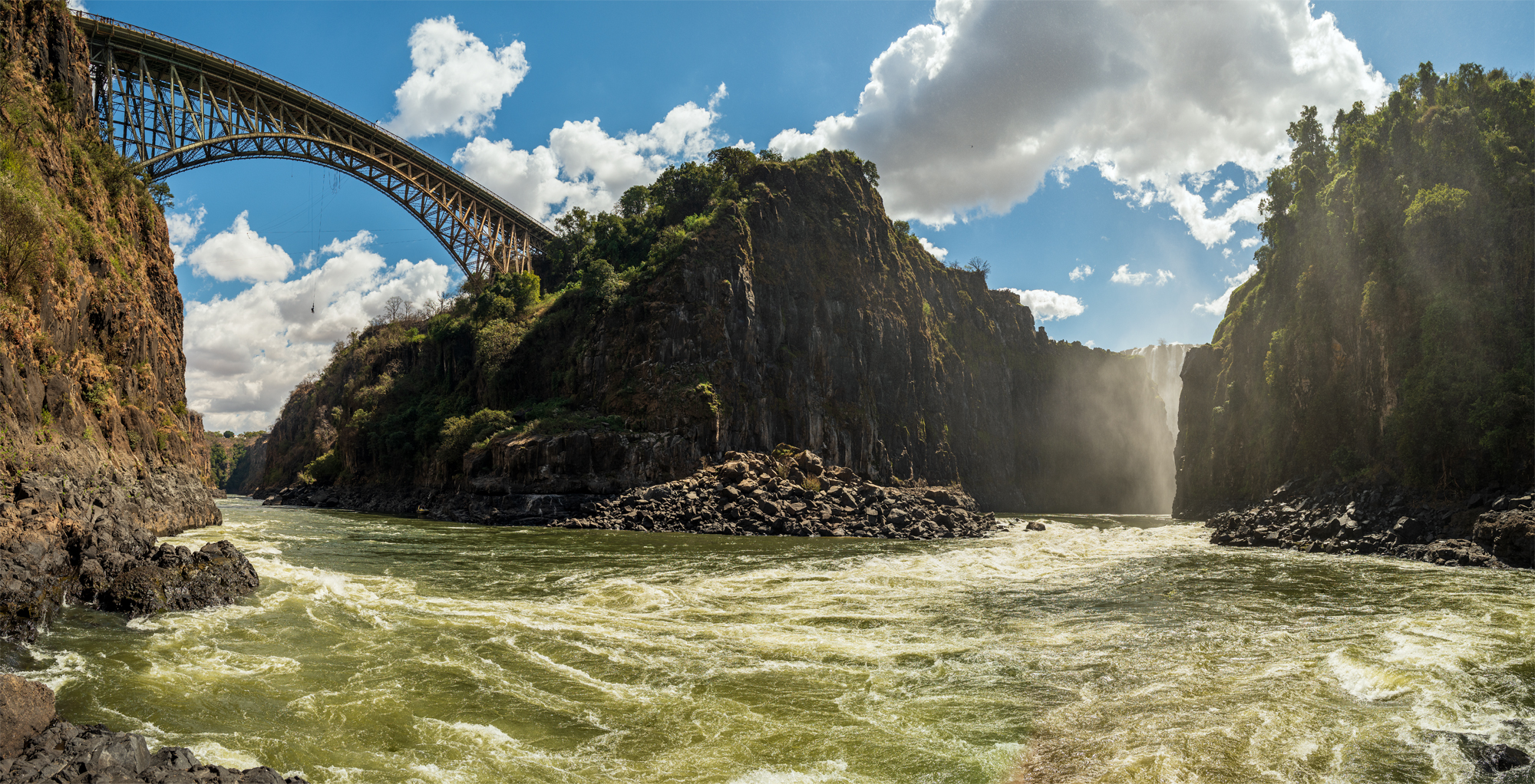 Wenn der mächtige Sambesi an den Victoria-Fällen auf einer Breite von 1.688 Metern bis zu 108 Meter in die Tiefe stürzt, dann hat er von seiner Quelle im äußersten Nordosten Sambias bereits 1.440 Kilometer durch Sambia und Angola zurückgelegt und noch knapp 1.300 Kilometer bis zum Mündungsdelta am Indischen Ozean (Kanal von Mosambik) in Mosambik vor sich. Er ist damit der viertlängste Fluss Afrikas und der bedeutendste Strom im Süden des Kontinents.