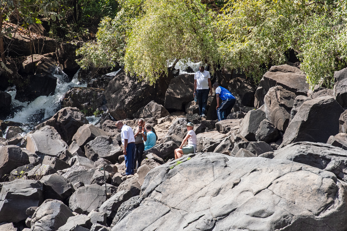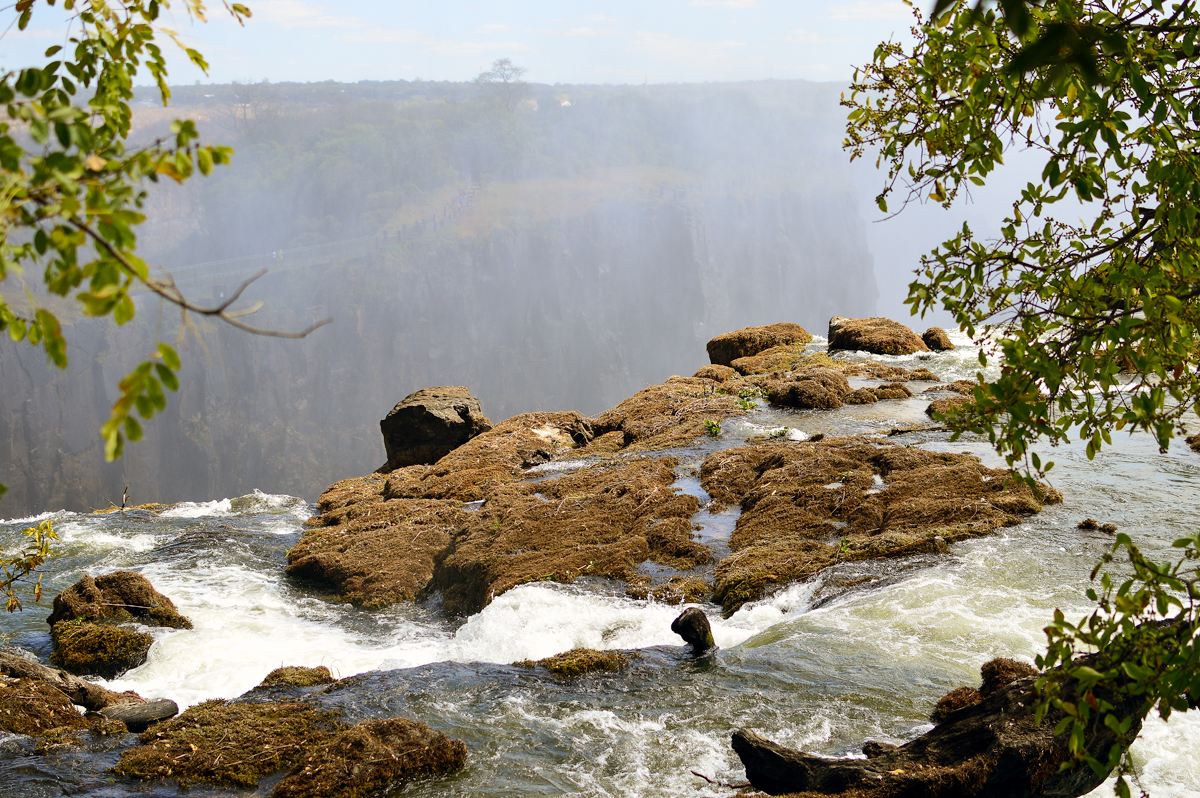 Knapp oberhalb der Abbruchkante präsentiert sich der Sambesi noch als scheinbar seichter, ruhiger Steppenfluss. Doch das Bild ist trügerisch, es gibt viele Strudel zwischen Felsen und Inseln, und die beträchtliche Breite von gut anderthalb Kilometern spricht für sich. Der Name Sambesi geht auf die Tonga zurück und bedeutet großer Fluss! Die Vorfahren der Tonga waren bereits in vorchristlicher Zeit, vermutlich etwa 2.000 v. Chr., von der heutigen DR Kongo aus in das Gebiet zwischen Sambesi und Kafue gezogen. Die Tonga sind traditionell Rinderhirten, und trotz aller Widrigkeiten, wie etwa den Diebstählen und Überfällen durch die kriegerischen benachbarten Kololo oder Lozi, sind sie das bis heute geblieben. Sie sind noch immer das Rückgrat der sambischen Fleischproduktion, namentlich des Unternehmens Zambeef. Feeding the nation!