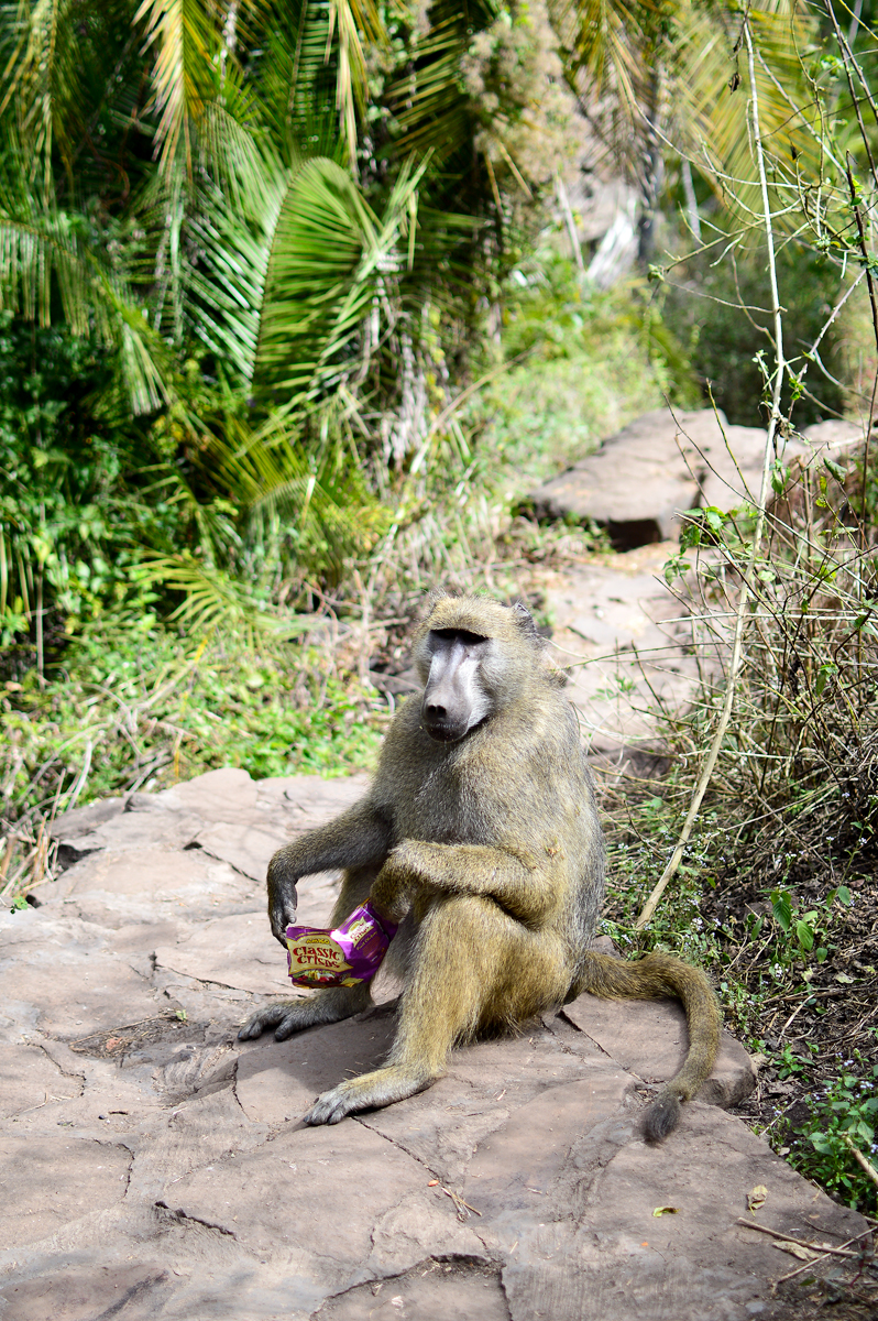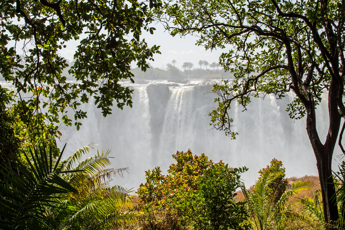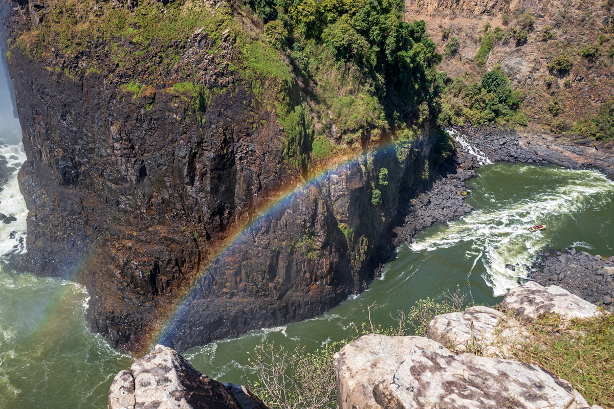 Am Ende des Palm Grove Trails wartet in der Tiefe der sogenannte Boiling Pot („Kochtopf“), der wohl beeindruckendste Ort an den Fällen, wo man der engen Schlucht, durch die sich die Wassermassen zwängen, am nächsten ist. Unterhalb der Brücke nach Simbabwe laden die Felsen zum Verweilen und Staunen ein, dem brodelnden Sambesi ganz nah, während drumherum steile, dichtbewachsene Felswände in kräftigem Grün leuchten.