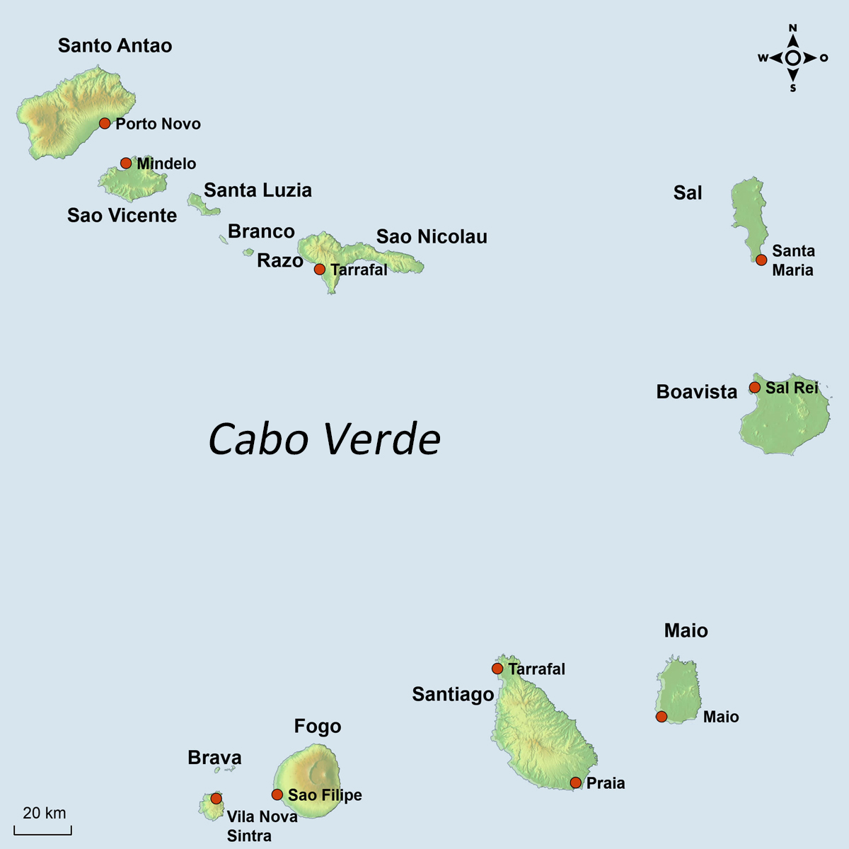 Kap Verde ist ein Inselstaat gut 500 km vor der Küste Westafrikas mit neun bewohnten sowie zahlreichen kleineren bis kleinsten unbesiedelten Inseln. Grundsätzlich unterscheidet man zwischen den Nordinseln, den Ilhas de Barlavento, Boa Vista, Sal, São Nicolau, Ilhéu Raso (unbewohnt), Ilhéu Branco (unbewohnt), Santa Luzia (unbewohnt), São Vicente und Santo Antão, und den Südinseln, den Ilhas de Sotavento, Maio, Santiago, Fogo sowie Brava mit den unbewohnten Ilhéus do Rombo. Landschaftlich könnten die Inseln nicht unterschiedlicher sein, von den flachen und ziemlich öden Sandinseln Maio, Boa Vista und Sal, von denen die beiden letztgenannten bereits vom Massentourismus geentert wurden, über die gebirgigen und stellenweise üppig-grünen Inseln des Nordwesten, São Nicolau und Santo Antão, bis zu jenen im Südwesten, Santiago, Fogo und Brava.